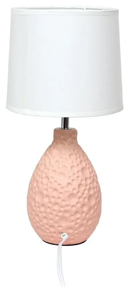A charming and practical table lamp to meet your fashion lighting needs. This lamp features an oval texturized stucco ceramic base and a white fabric shade. Perfect for living room, bedroom, office, kids room, or college dorm! Texturized stucco oval ceramic baseWhite fabric shade. Perfect for living room, bedroom, office, kids room, or college dormHeight: 14" Shade diameter: 7.25".Uses 1 x 60W Medium Base Bulb (not included)- A charming and practical table lamp - This lamp features an oval texturized stucco ceramic base - Perfect for living room, bedroom, office, kids room, or college dorm!- Texturized stucco oval ceramic base- Fabric shade- Height: 14" Shade diameter: 7.25"- Uses 1 x 60W Medium Base Bulb (not included)