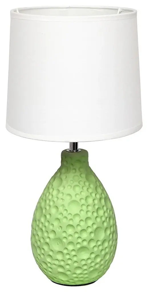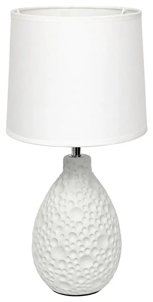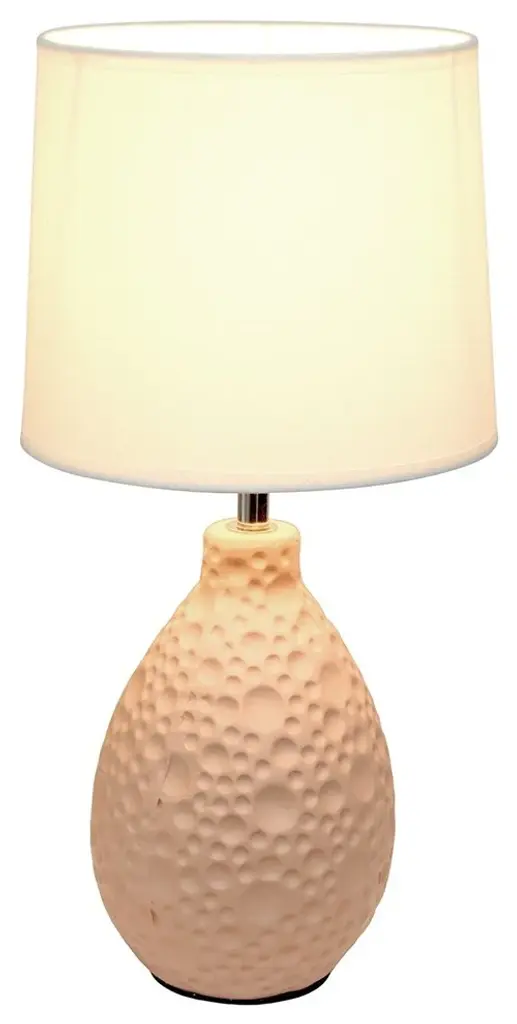 A charming and practical table lamp to meet your fashion lighting needs. This lamp features an oval texturized stucco ceramic base and a white fabric shade. Perfect for living room, bedroom, office, kids room, or college dorm! Texturized stucco oval ceramic baseWhite fabric shade. Perfect for living room, bedroom, office, kids room, or college dormHeight: 14" Shade diameter: 7.25".Uses 1 x 60W Medium Base Bulb (not included)- A charming and practical table lamp - This lamp features an oval texturized stucco ceramic base - Perfect for living room, bedroom, office, kids room, or college dorm!- Texturized stucco oval ceramic base- Fabric shade- Height: 14" Shade diameter: 7.25"- Uses 1 x 60W Medium Base Bulb (not included)