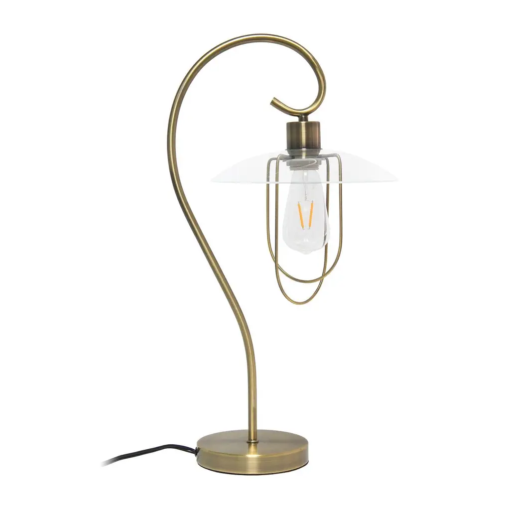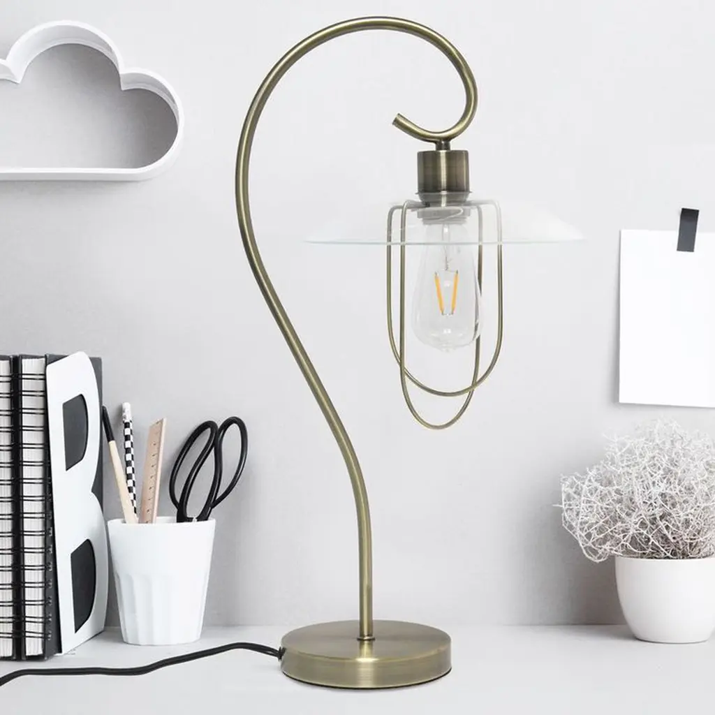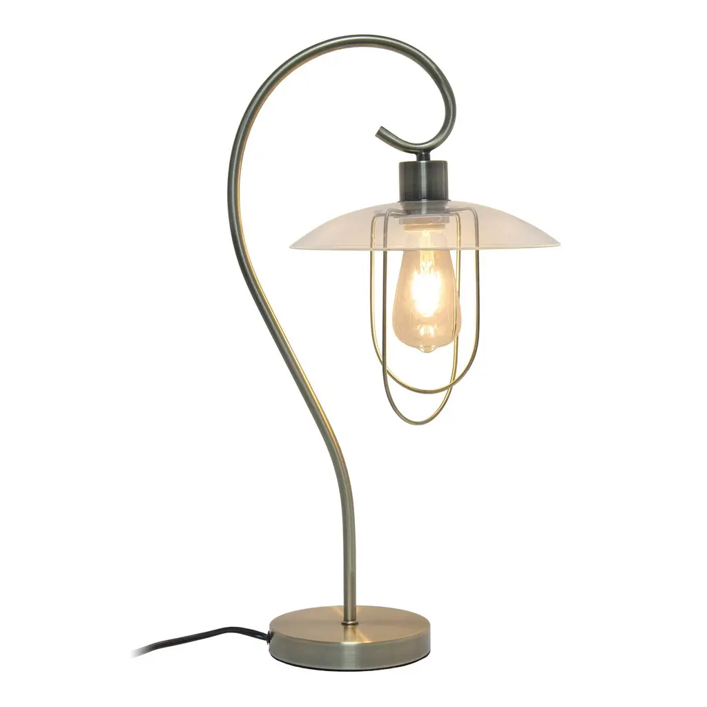 This modern table lamp features a curved metal base with a clear glass shade. Beautifully crafted in a vareity of finishes to choose from, this lamp will add a touch of elegance to any room in your home. Perfect for living room, bedroom, office, or anywhere you need to add fashion lighting. **HELPFUL TIP: To get the complete industrial look, we recommend using a decorative Edison/Vintage bulb (not included). ** "Features: