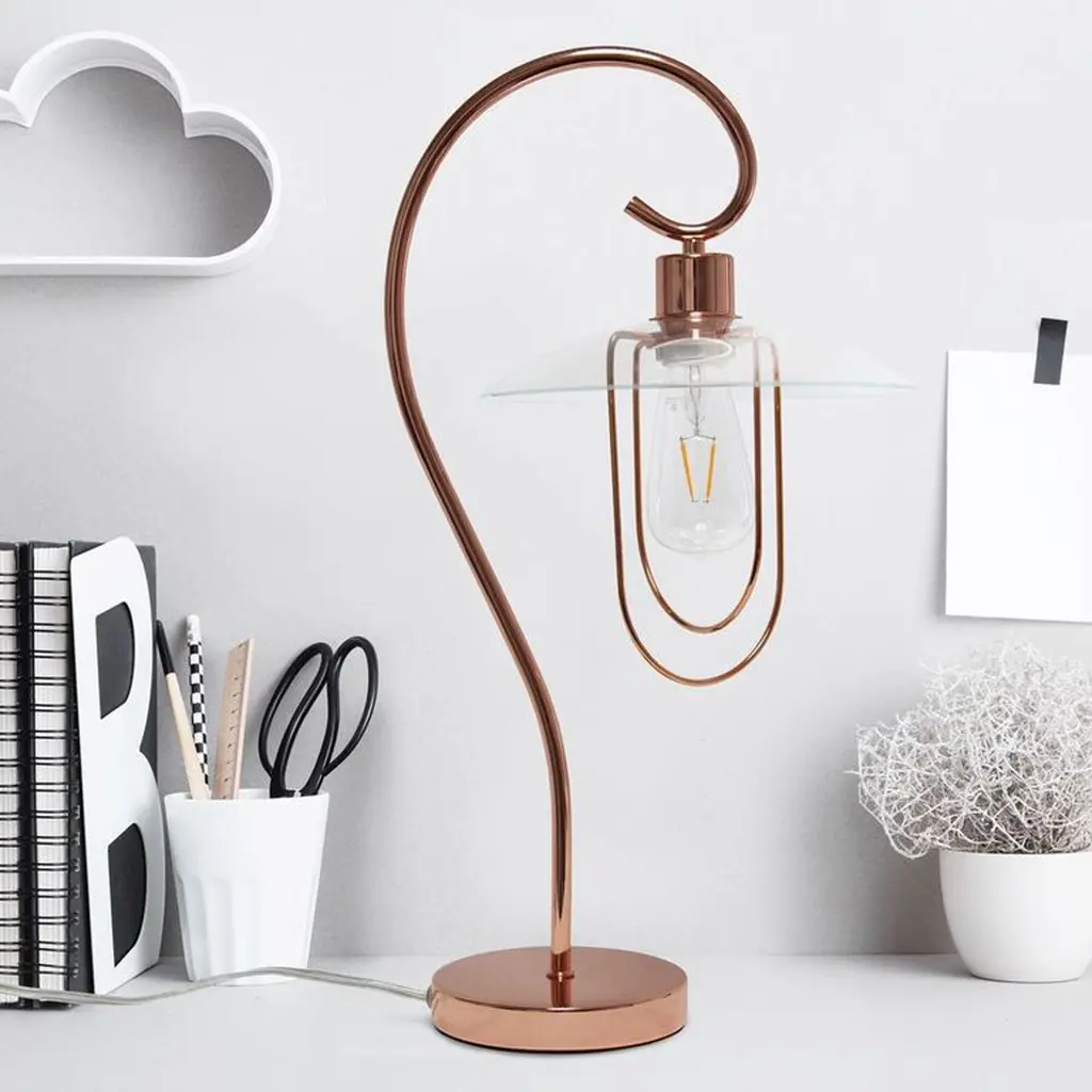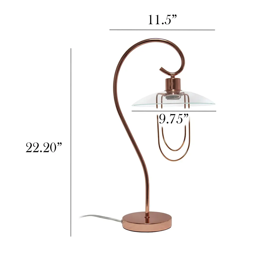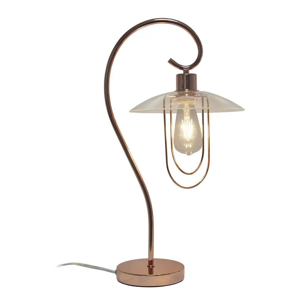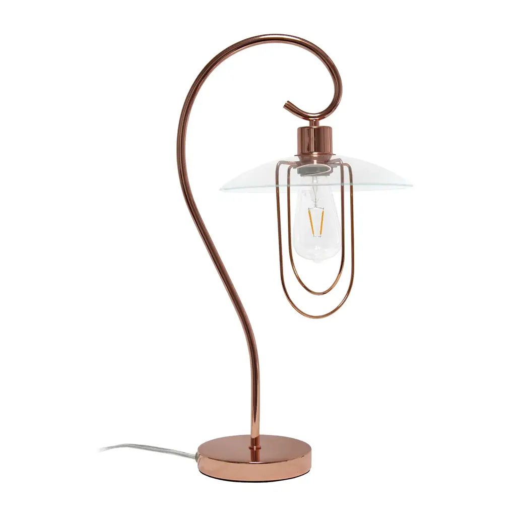 This modern table lamp features a curved metal base with a clear glass shade. Beautifully crafted in a vareity of finishes to choose from, this lamp will add a touch of elegance to any room in your home. Perfect for living room, bedroom, office, or anywhere you need to add fashion lighting. To get the complete industrial look, we recommend using a decorative Edison/Vintage bulb (not included).Features:Rose Gold metal base. Clear glass shade. Easily accessible on/off switch located on the cord. Uses 1 x 40W medium type A base bulb (not included).Available in additional color options. Base Type: E26 Medium Base. Material Breakdown: 70% Iron 30% Glass.Primary Material: Iron. Style: Modern. Cord Length: 60. Cord Color: Black.Shade Material: Glass/Iron. Switch Type: On/Off Rocker Switch. Bulb Type: Incadescent (A19/B10/T45).Product Dimensions: 11.5"Lx9.75"Wx22.2"H, Weight: 3.75lbs. Lamp measures: 11.5"L x 9.75"W x 22.2"H.