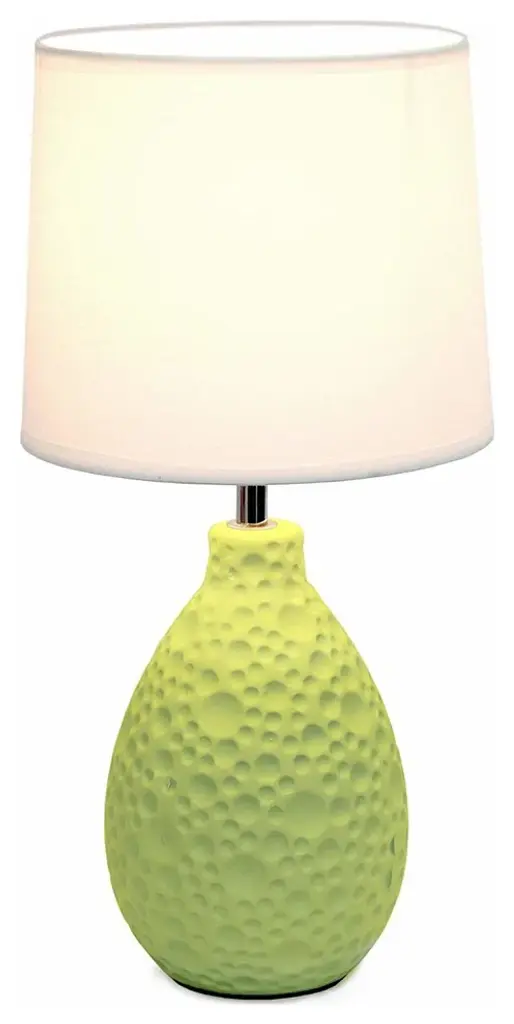 Simple Designs Textured Stucco Ceramic Oval Table Lamp.A charming and practical table lamp to meet your fashion lighting needs. This lamp features an oval textured stucco ceramic base and a white fabric shade. Perfect for living room, bedroom, office, kids room, or college dorm!Textured stucco oval ceramic baseWhite fabric shadePerfect for living room, bedroom, office, kids room, or college dormHeight: 14.17" Shade Diameter: 7.25"UL PartsBulb Type: IncandescentSwitch Type: RotarySwitch Location: CordShade Security: Socket NutNumber of Lights: 1Maximum Wattage: 60Shade Material: FabricCord Color: WhiteFinish/Color: GreenPrimary Material (Leather, Metal, Wood): CeramicBase Type: E26 Medium BaseBulb Included: NoWe don''t sale in California