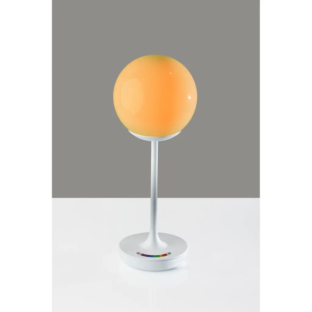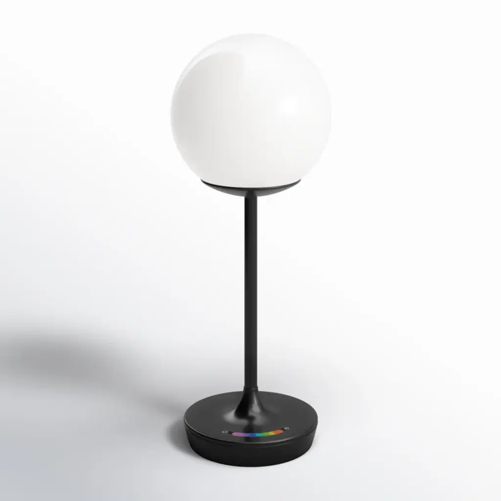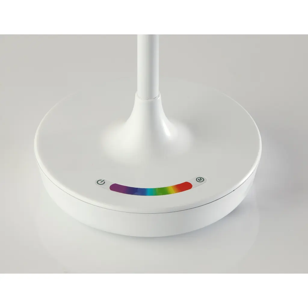 The Millie LED color changing table lamp is both versatile and fun. Place this in the bedroom as a nightlight or bring it outside for outdoor mood lighting. With a 39" USB charging cord, it's simple to charge up to carry with you wherever it's needed. Offering three levels of regular white light and a wide range of colored light options on a convenient touch bar switch, this lamp is sure to satisfy your needs. With an outdoor certification for damp locations, this is the perfect addition to your backyard or camping setup. This lamp reaches a full charge after charging for about 2-3 hours, and the battery lasts for a minimum of 5 hours. This lamp is available in black and white finishes and coordinates perfectly with the Millie LED color changing table lantern. Features: White or Black Finish Rechargeable with a 39" USB Charging Cord - charge lasts for minimum of 5 hours Outdoor certified for damp locations Use the touch bar RGB switch to change the color of the light A touch dimmer switch allows for 3 levels or warm, white light ETL Listed li> CRI: 80; Color Temp: 3,000K; 150 Lumens 1-Year Limited Manufacturer Warranty Measurements: Height: 15.25-inch Width: 6-inches Extension/Depth: 6-inch Weight: 1.04lbs Shade Dimensions: 6" Dia Base Dimensions: 5" Dia. X 1"H.