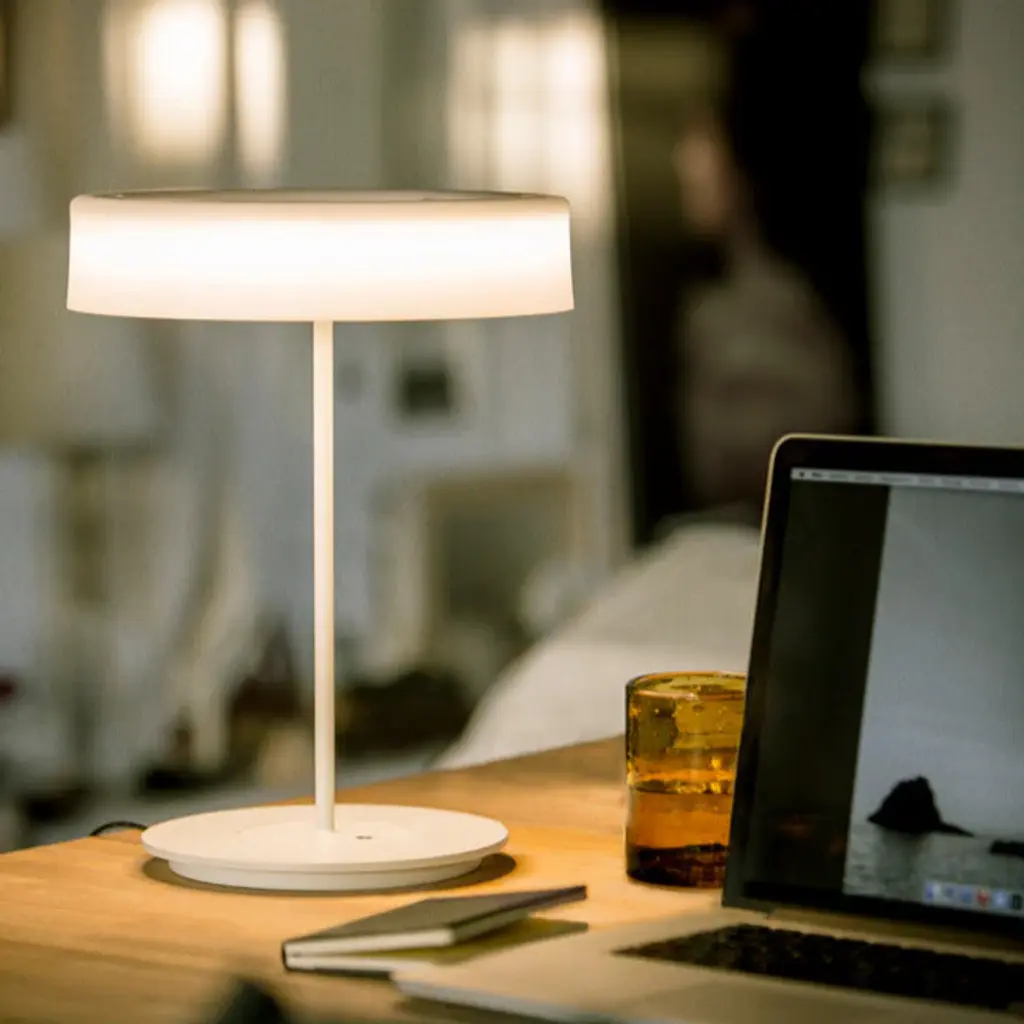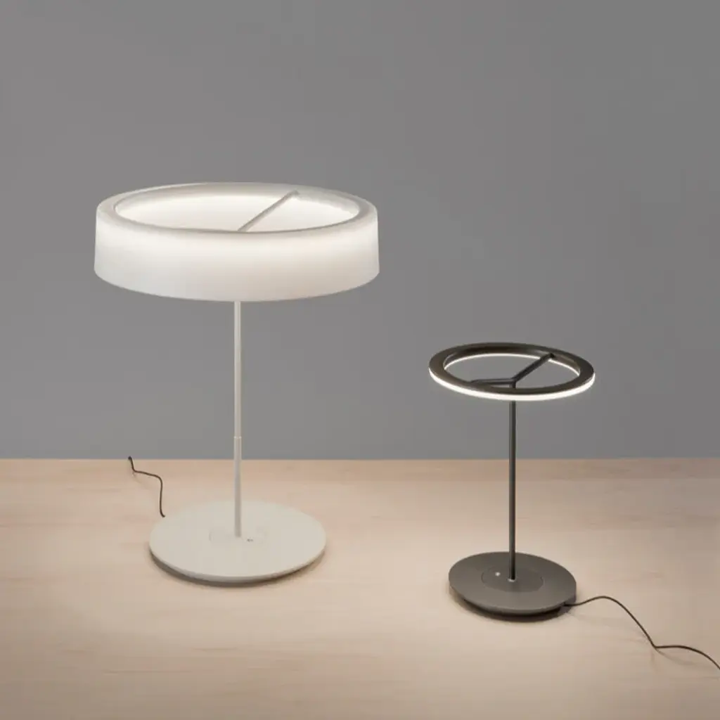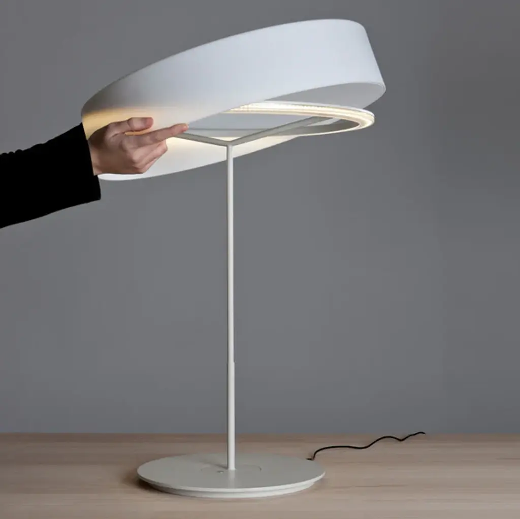 This lamp is named after everything it does without, particularly if it is used without a shade. Commissioned to Antoni Arola in order to transform it into the new basic Santa & Cole lamp in the wake of the LED revolution, it manages to fuse simplicity and technology in order, leaving a luminous ring elegantly hanging in the air. The light can be dimmed using the switch housed in the base, and the larger model on full power can broadly light up any work surface. Features