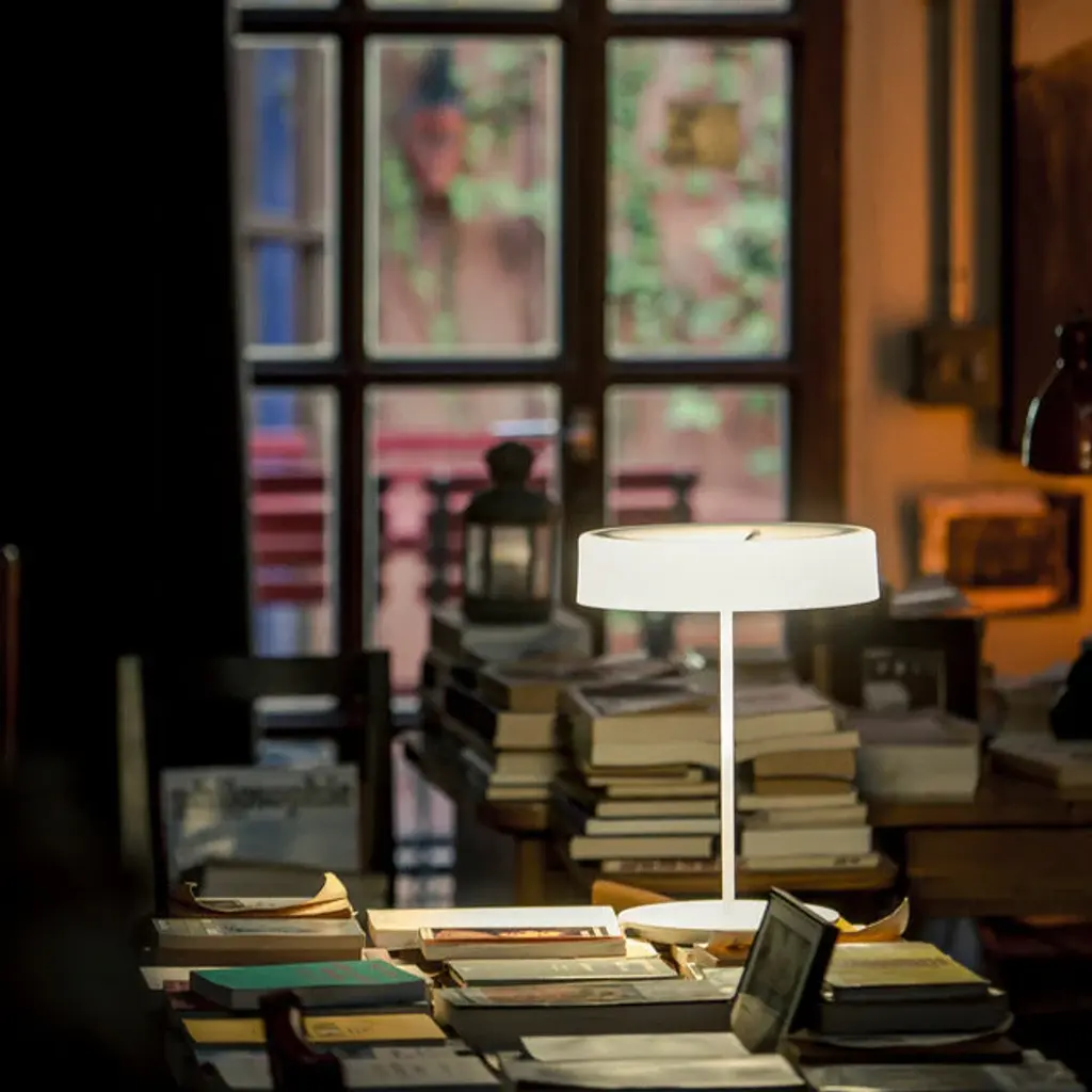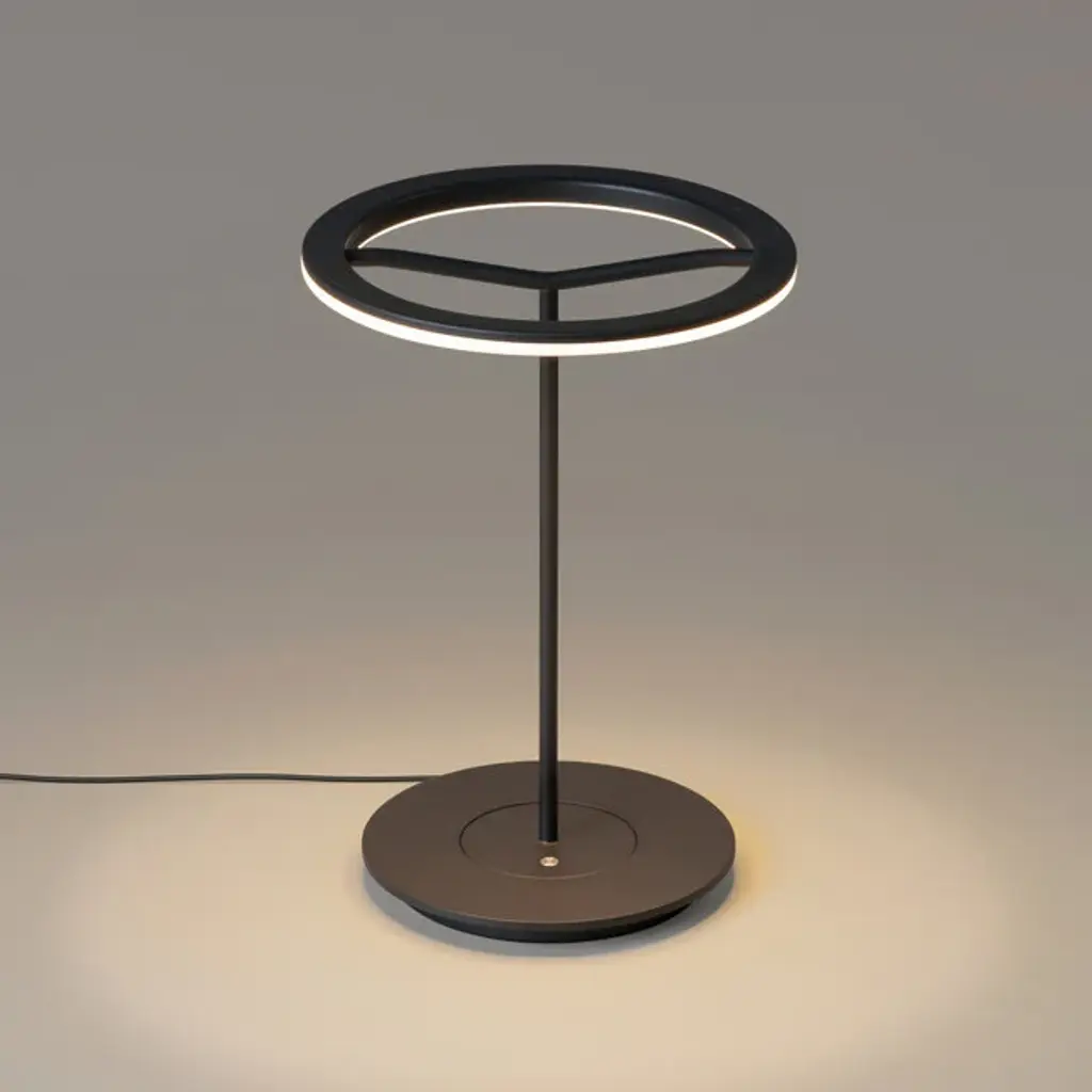 This lamp is named after everything it does without, particularly if it is used without a shade. Commissioned to Antoni Arola in order to transform it into the new basic Santa & Cole lamp in the wake of the LED revolution, it manages to fuse simplicity and technology in order, leaving a luminous ring elegantly hanging in the air. The light can be dimmed using the switch housed in the base, and the larger model on full power can broadly light up any work surface. Features