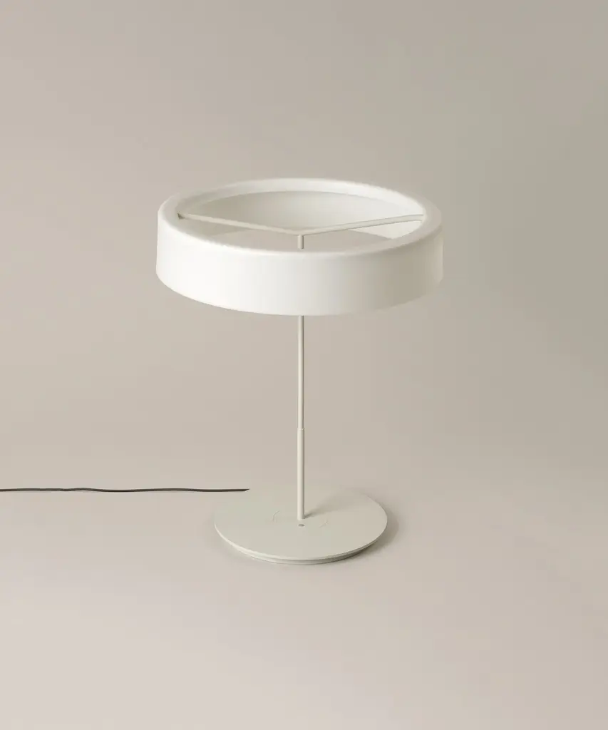 A lamp that combines simplicity and technology to create a lucent ring of light suspended in the air. It comes in two sizes, both available in matte white or graphite, to which a shade can be affixed. Or they can be left without a shade, unapologetic. Sin broadly illuminates any work surface with direct, warm light, and does not take up space on a desk because all kinds of errant items can be kept on its base, including papers. Produced by the Barcelona-based lighting purveyor, Santa & Cole.