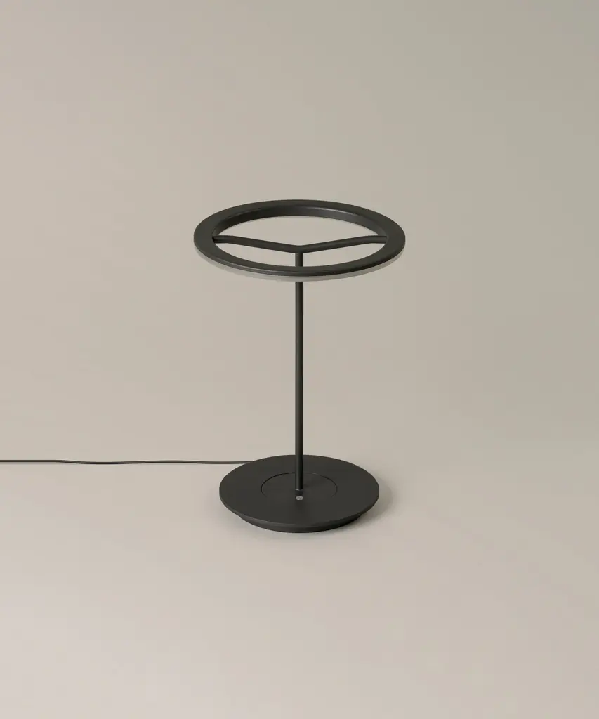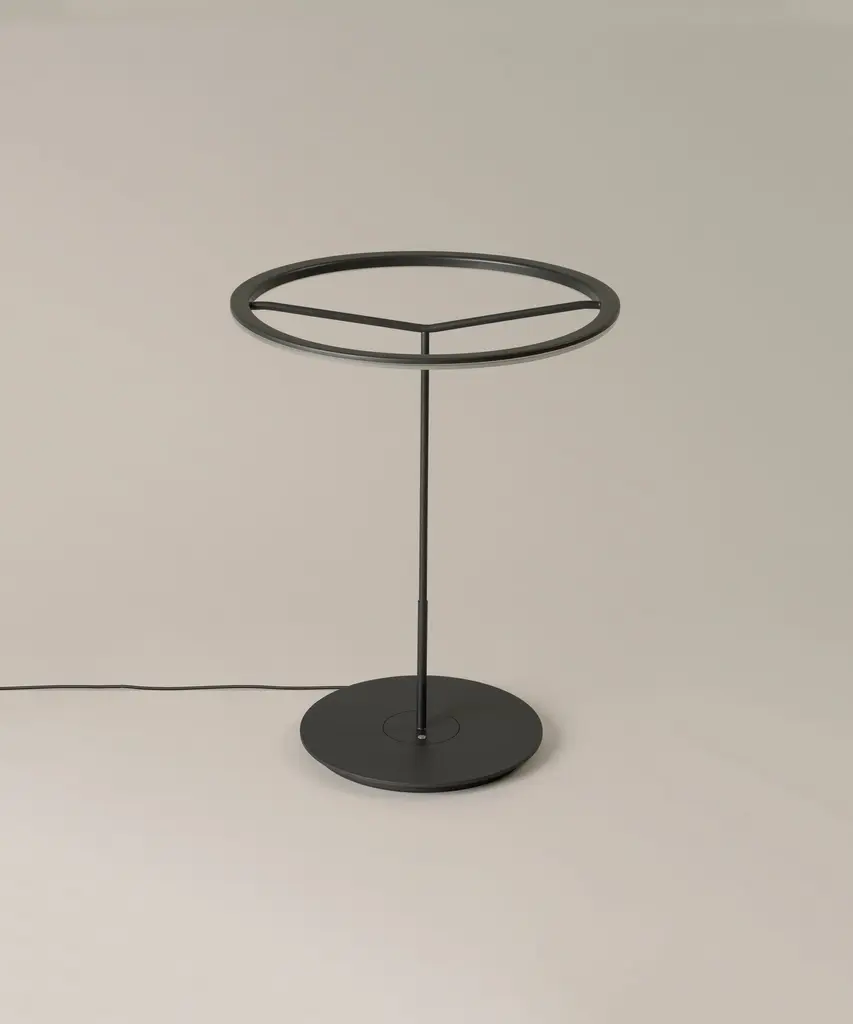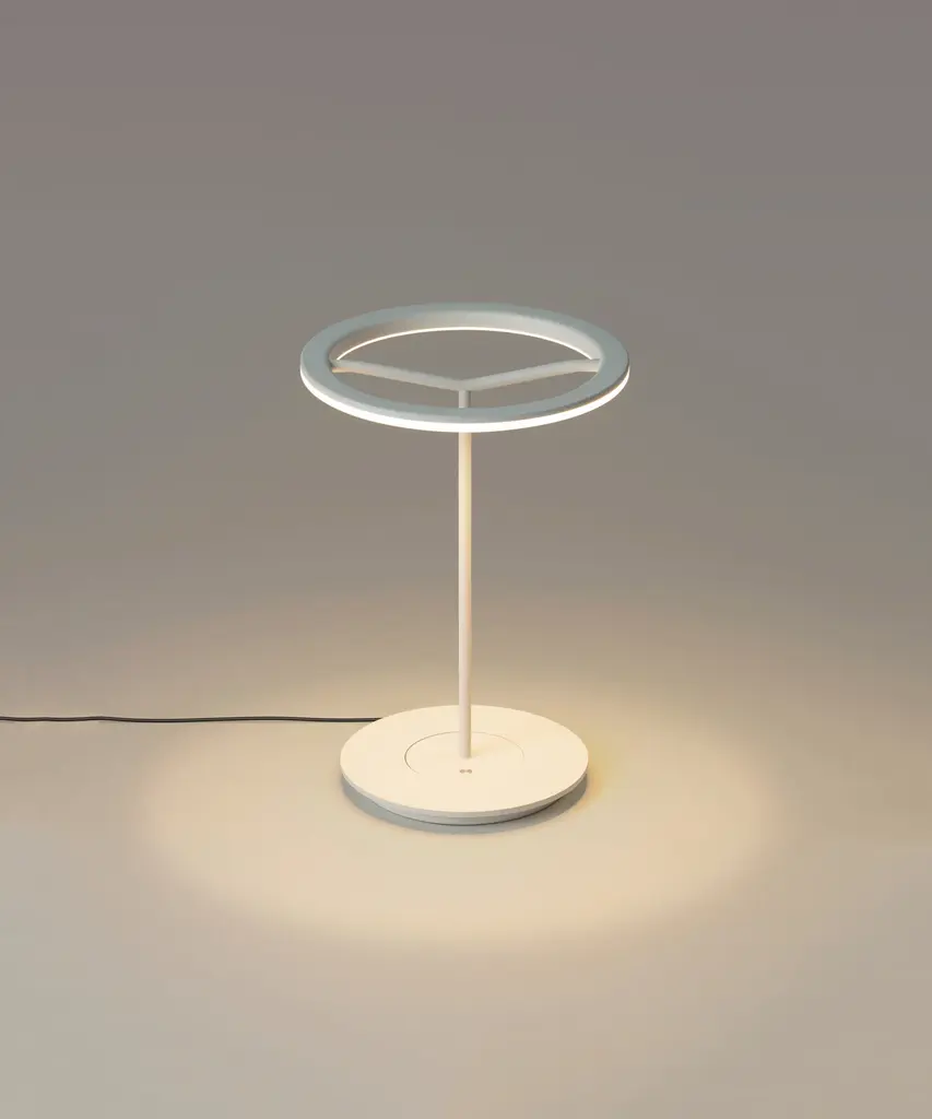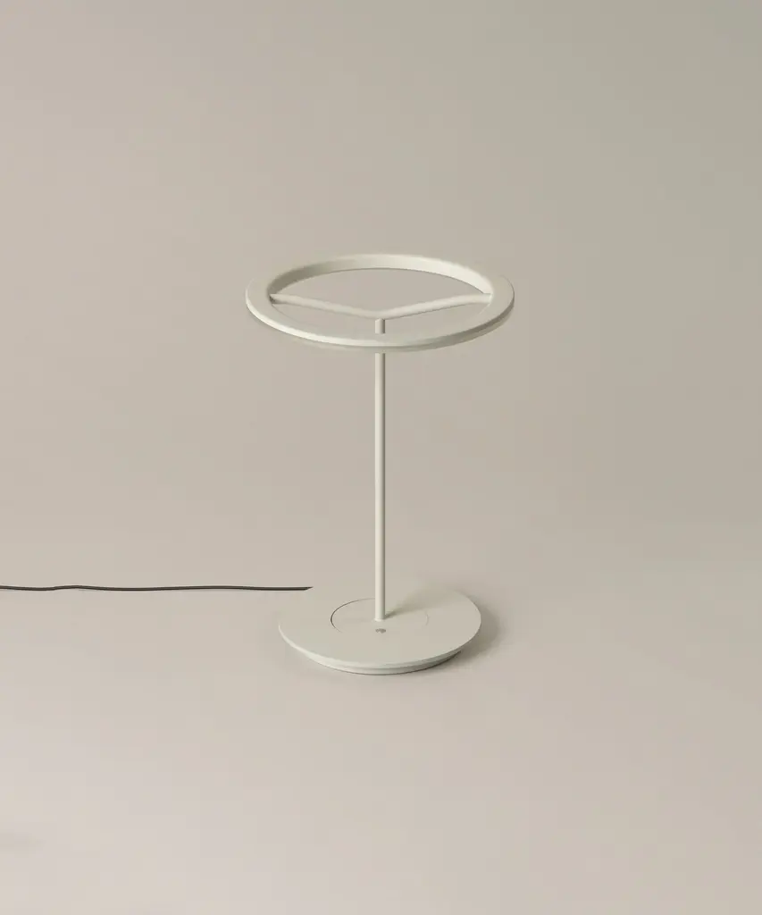 A lamp that combines simplicity and technology to create a lucent ring of light suspended in the air. It comes in two sizes, both available in matte white or graphite, to which a shade can be affixed. Or they can be left without a shade, unapologetic. Sin broadly illuminates any work surface with direct, warm light, and does not take up space on a desk because all kinds of errant items can be kept on its base, including papers. Produced by the Barcelona-based lighting purveyor, Santa & Cole.