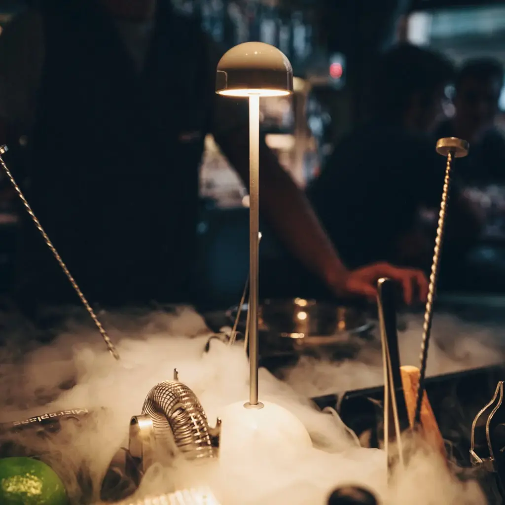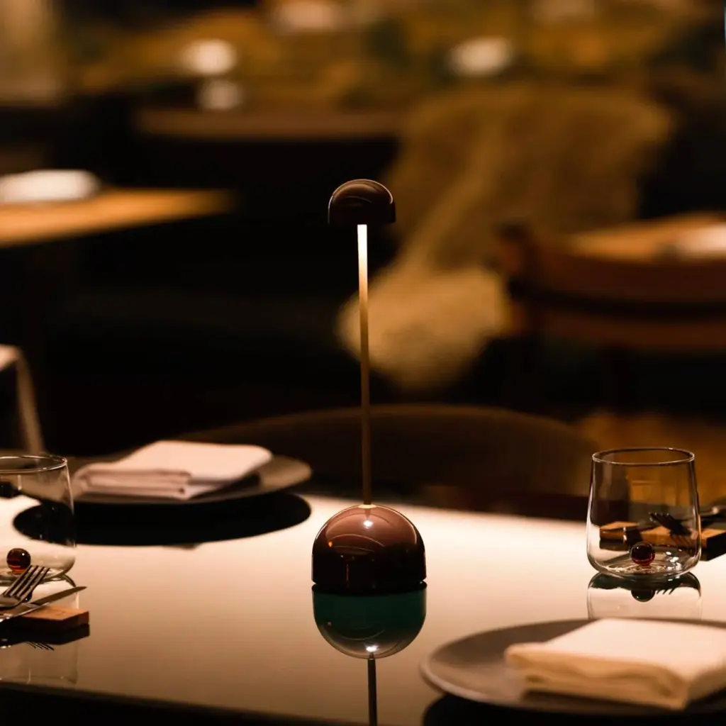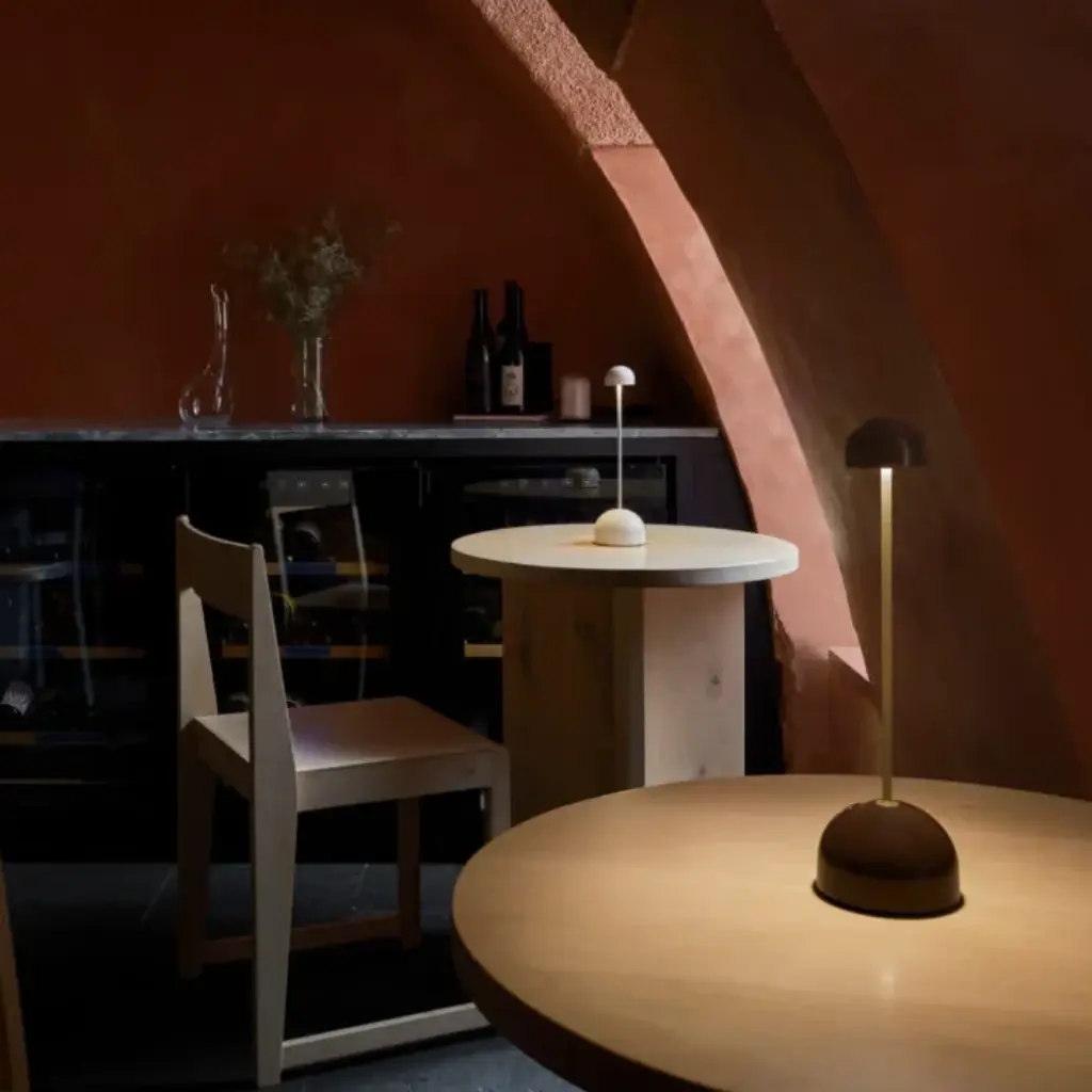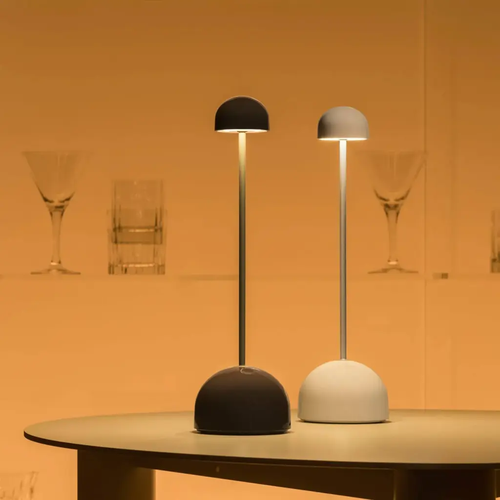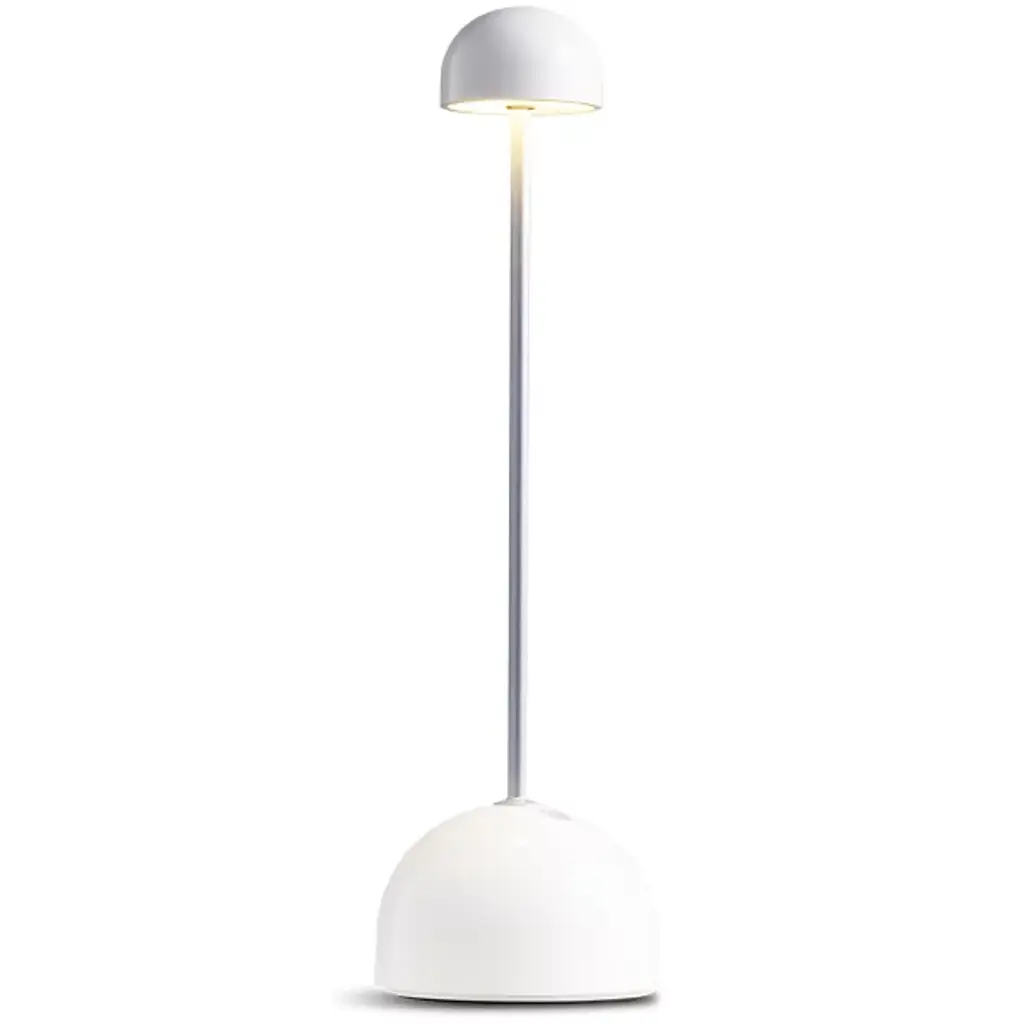 The Sips Portable Table Lamp showcases a gently rounded opaque shade that softly diffuses light onto surfaces without causing glare. A cylindrical stem supports the shade and connects to a wide, stable base, which includes touch-sensitive controls offering three brightness levels. Designed for versatility, the lamp is lightweight, cordless, and easy to move. It is available in two finishes: warm white with a silver stem and dark brown with a gold-finished stem.