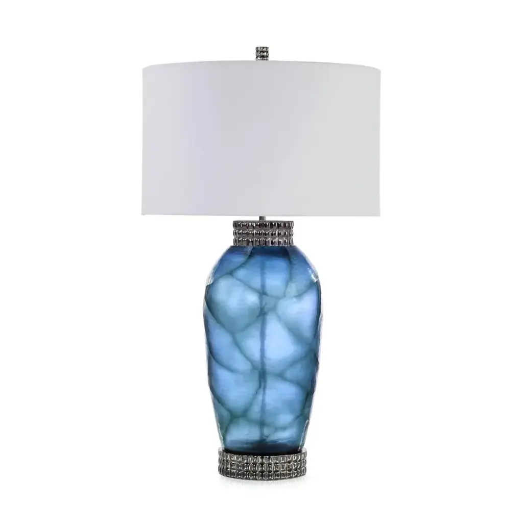 The Sirena Table Lamp is an elegant piece that imbues an interior space with sophisticated motifs. Crafted from art glass, stunning dark blue tones are paired with geometric brass accents in a Black Nickel finish at the neck and base. The look is completed by a Black Nickel finial and a white drum shade.