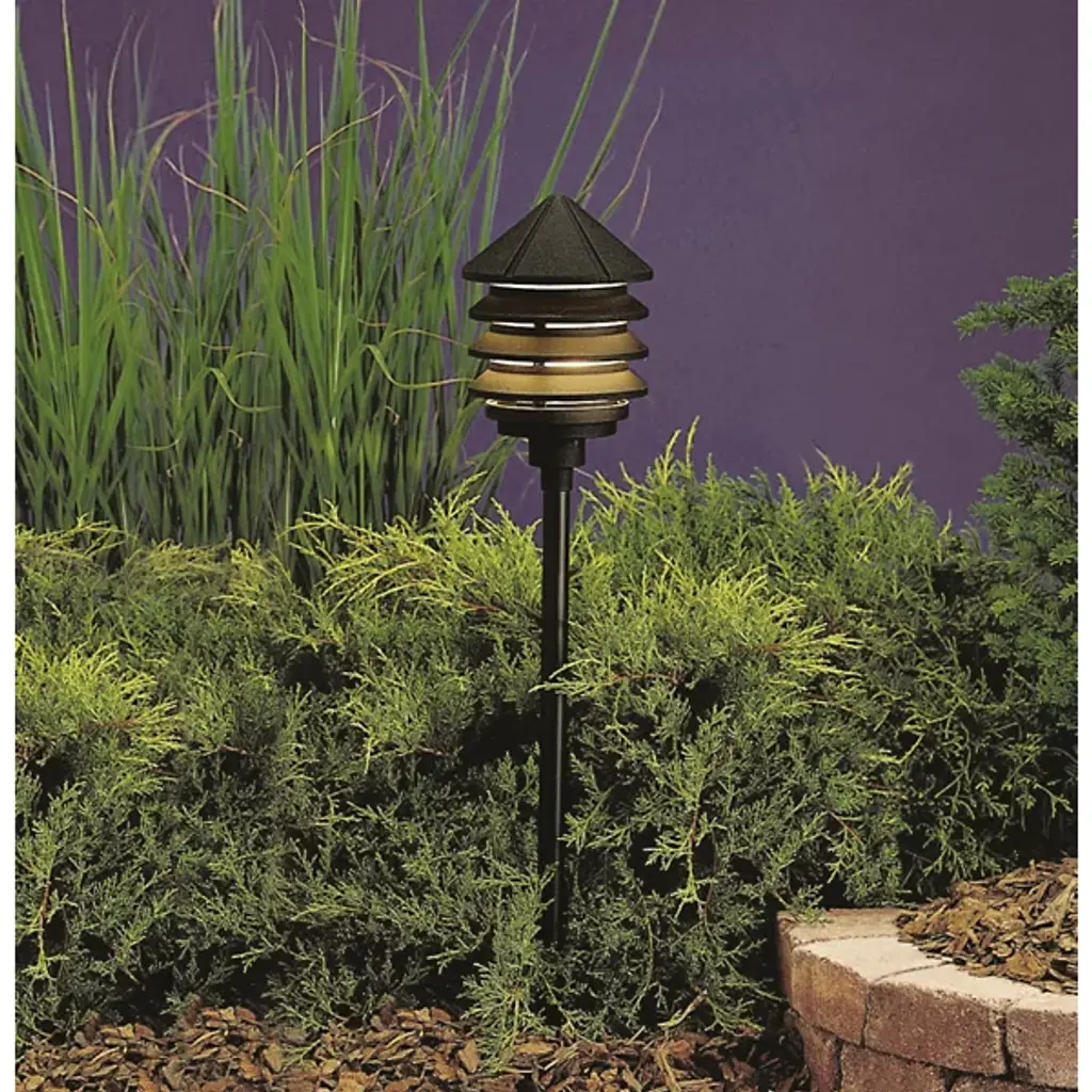 Add an elegantly layered ambiance to your exterior spaces with the cone-tipped and tasteful Six Groove 3-Tier Path Light from Kichler. An aluminum structure securely anchored by a slender stem, it places potent lamping beneath three tiers of louvers topped by a conical cap divided into segments. This arrangement captures most of the glare from the lamping, creating a sort of filter grate that dispenses a mixture of small beams of direct light to the side amid a warm ambiance that reflects off the louvers.