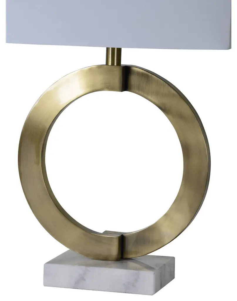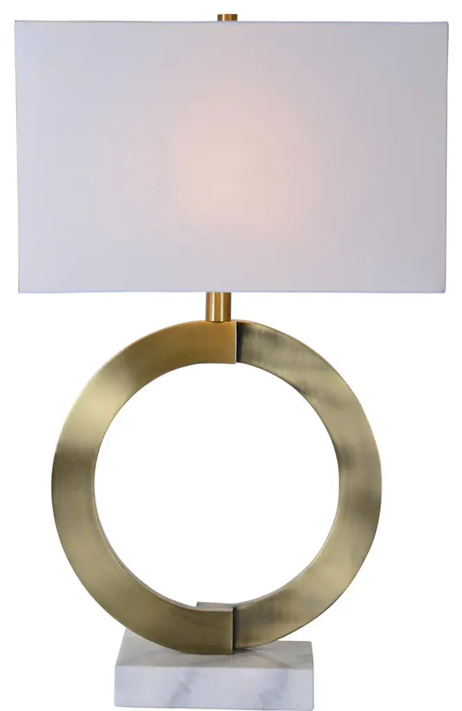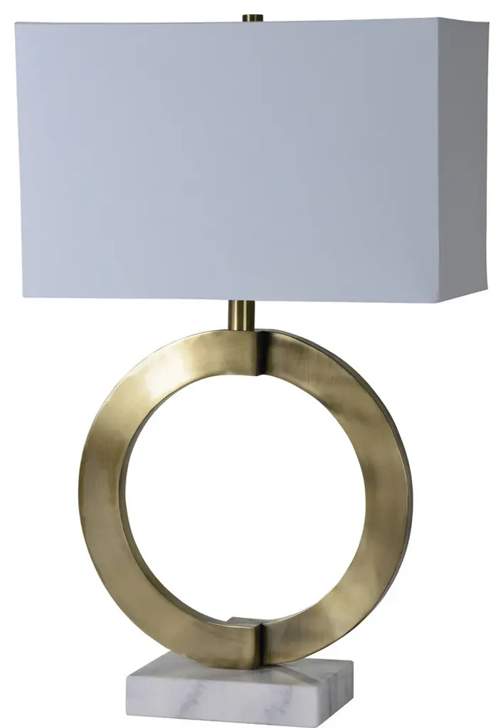 A seamless blend of warmth and edge, this modern design offers equal parts artistry and function. A myriad of antique bronze finished iron, white marble, and cream fabric, its unique structure makes it an ideal fit for the contemporary entryway table.1Bulbs Included: NoType of Bulb: E26Wattage: 100