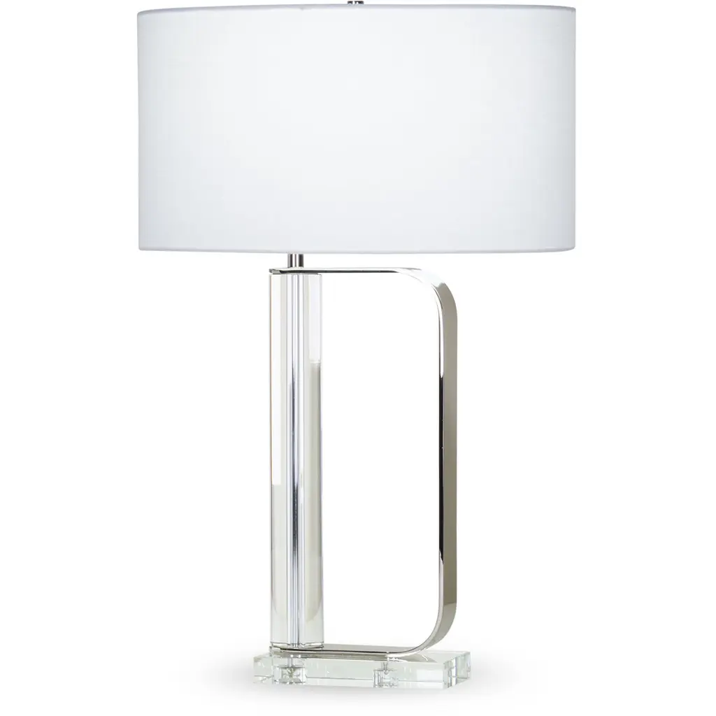 In this table lamp, a substantial piece of crystal sits atop a slim Bronze-finished piece of metal the same shape. The subtle effect it creates is elegant and striking. An oval Off-White cotton shade finishes the look, which would be a fitting addition to a neutral, modern bedroom or living room.