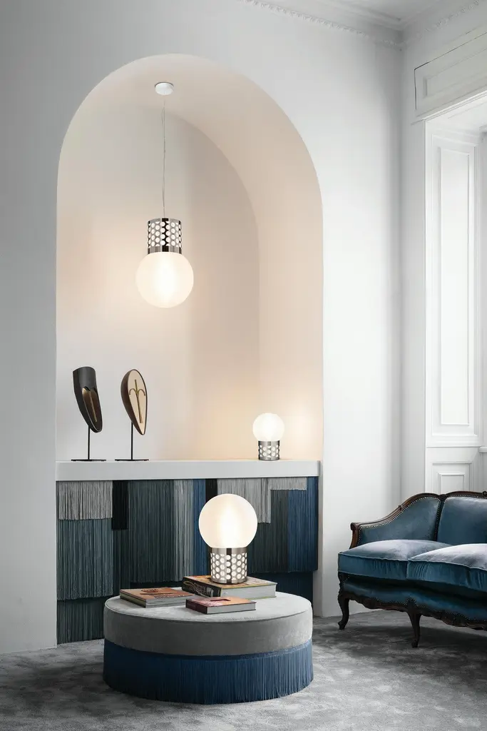 Atmosfera lies at the apex of fashion and design, where light melds into fabric. The new collection of table lamps are available in 2 sizes, and displays superimposed techno polymer layers create a polkadot effect. The lamps have independent switches in the sphere and base; the courtesy light is ideal for a late-night return home. Also available in a suspension lamp.Size: Ø 30 cm x H 44.5 cm / Ø 11-3/4” x H 17-1/4”, maximum cable length 140 cm / 55”Available colors: Gold, pewterMaterials: Methacrylate / Goldflex or PewterflexWith: Hand-finished sphereLight source: 2 x 12W LED filament.
