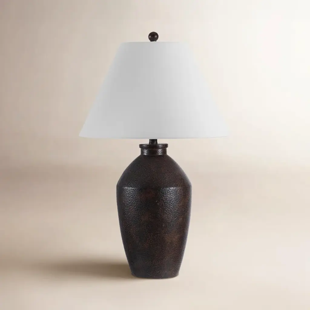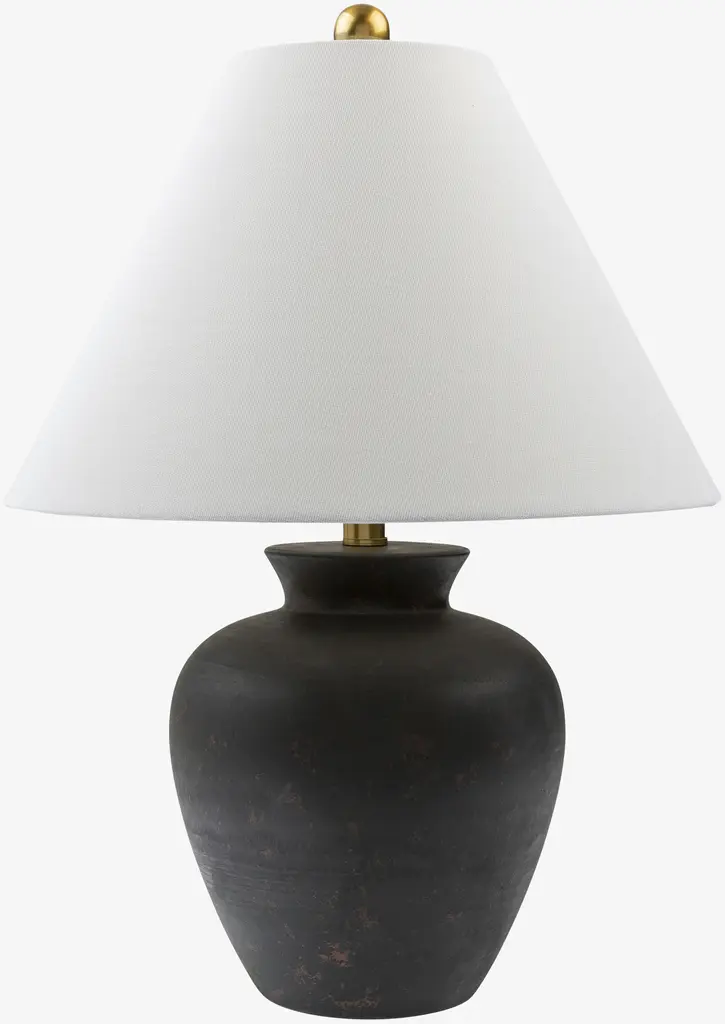 Illuminate your space with the Slate Table Lamp, complete with a black hand finished ceramic body, white linen shade, and aged brass accents.