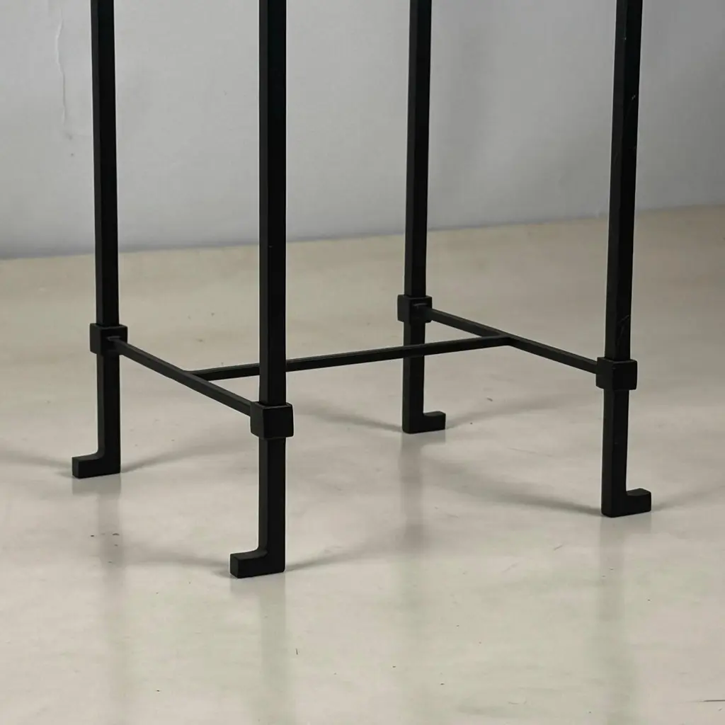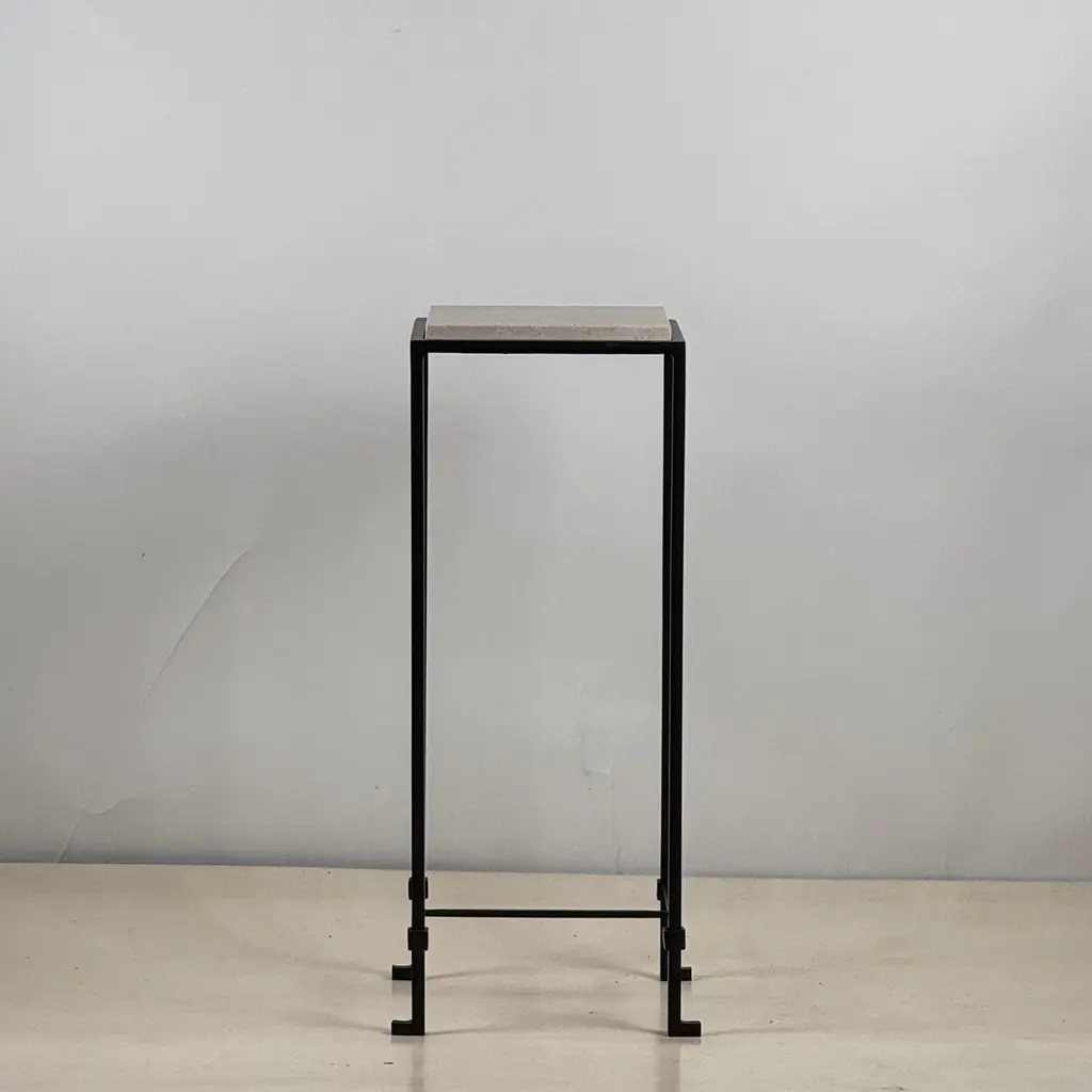 Elegant wrought iron and travertine 'Diagramme' small pedestal / tall side table by Design Frères. Clean lines and fine materials make for a luxurious pedestal for a sculpture, small lamp, or as a drinks table.