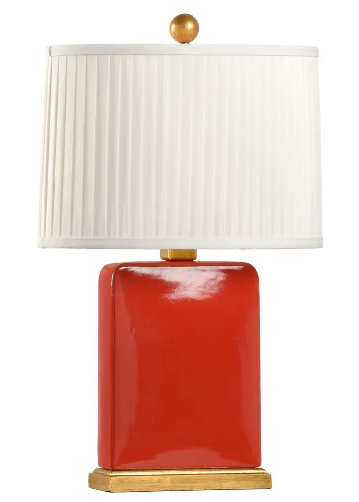 Small Bedside Lamp In Rhubarb Red Ceramic With Wood Accents.