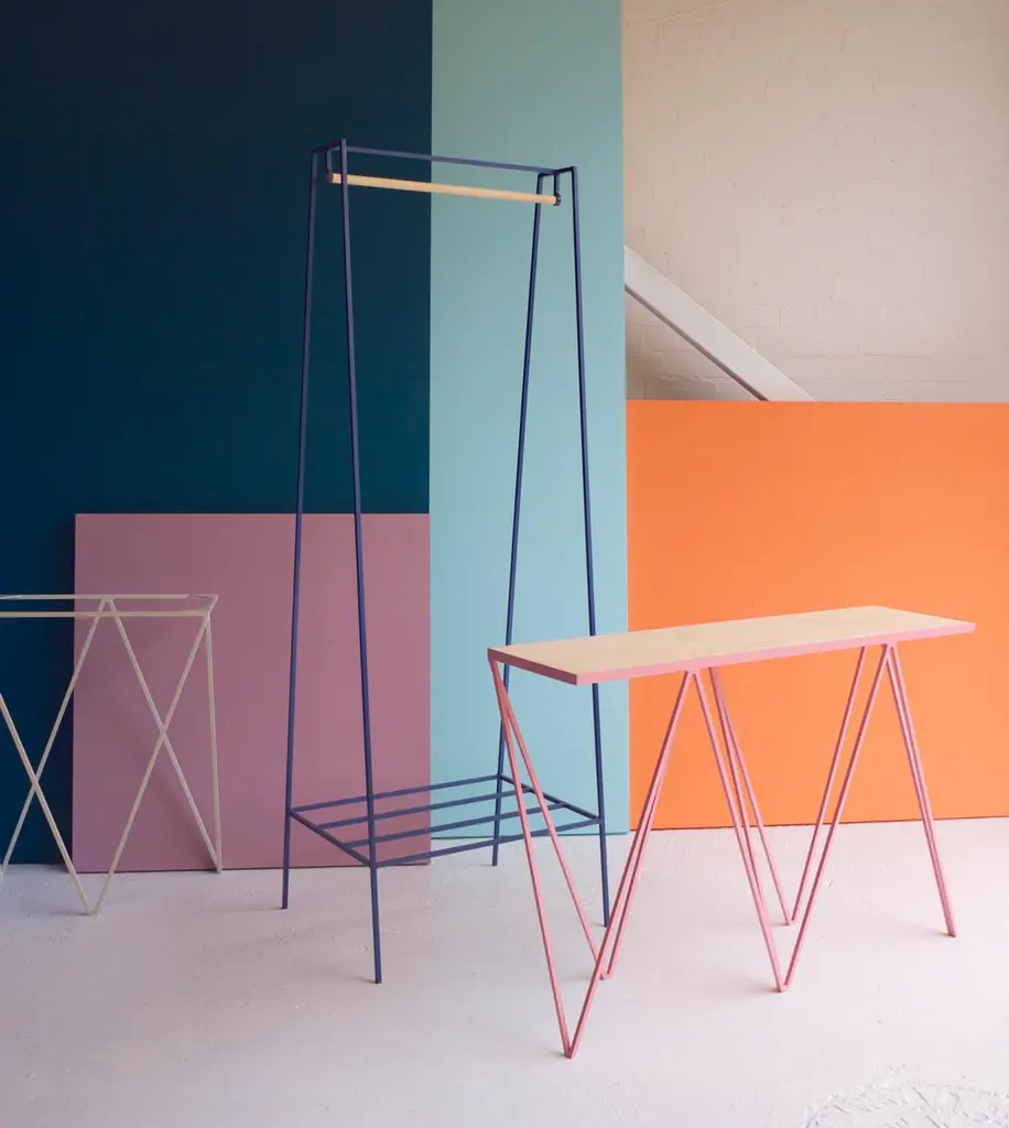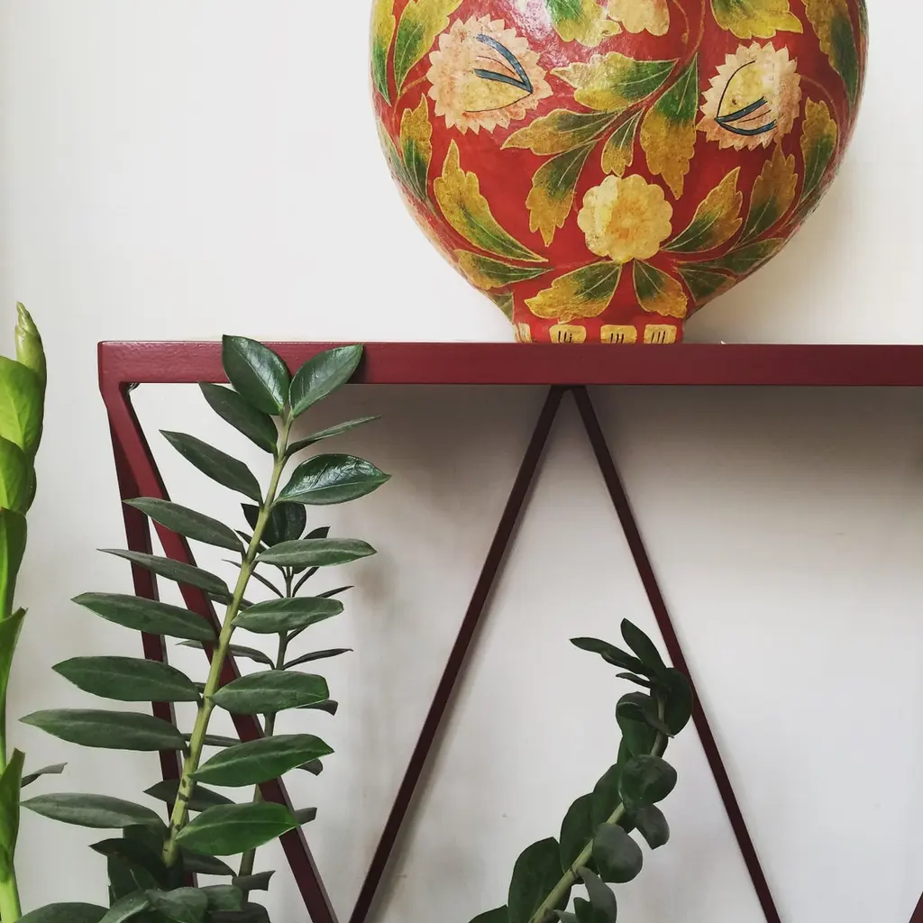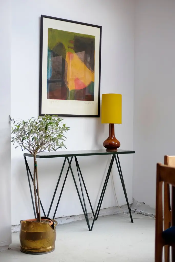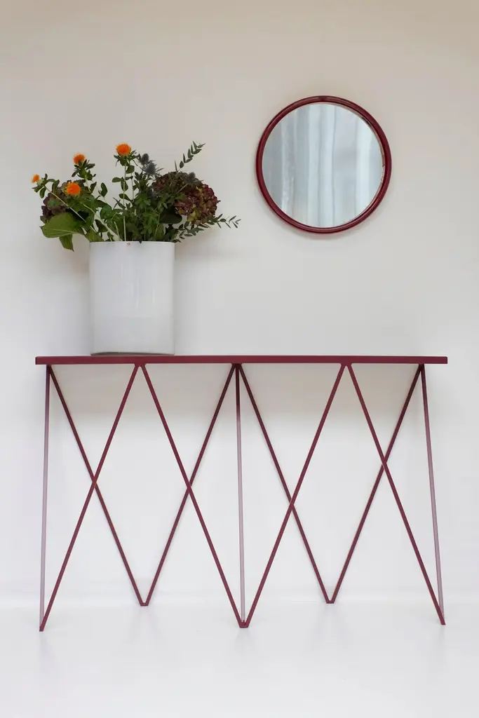 The Giraffe console table is a modern statement piece. The powder-coated steel console table looks stunning is the hallway with a bunch of flowers or as a lamp table in any room. The beauty of the Giraffe console table is that it works both against period details and modern surroundings due to its compact proportions; made with an elegant steel frame and a wooden top. The geometric leg design ensures that the table is sturdy and stable maintaining an elegant aesthetic. The console is available in fifteen powder-coated colours with a Birch plywood top finished in a satin varnish.The Giraffe console hold the Design Guild Mark for outstanding design and quality.Colour samples available to order from our storefront - LU2894331610202 All &New products are manufactured in Britain in small batches and hand-finished. We believe in local manufacturing. Our furniture has plenty of character as every weld is different. The result is a collection of modern British furniture that celebrates those little imperfections that make objects beautiful and unique.Measures: 110cm wide, 30cm deep, 73cm high.Mirka & Jo&New - Modern British FurnitureZig-zag-legs/ Registered design. Community design registration number: 002391813-0001.