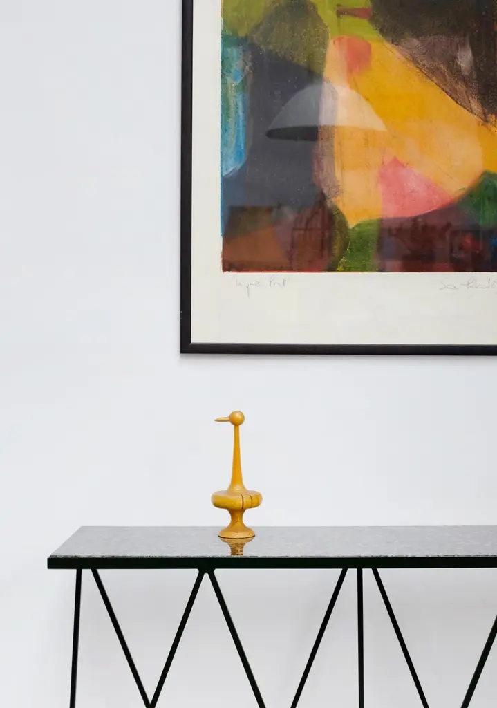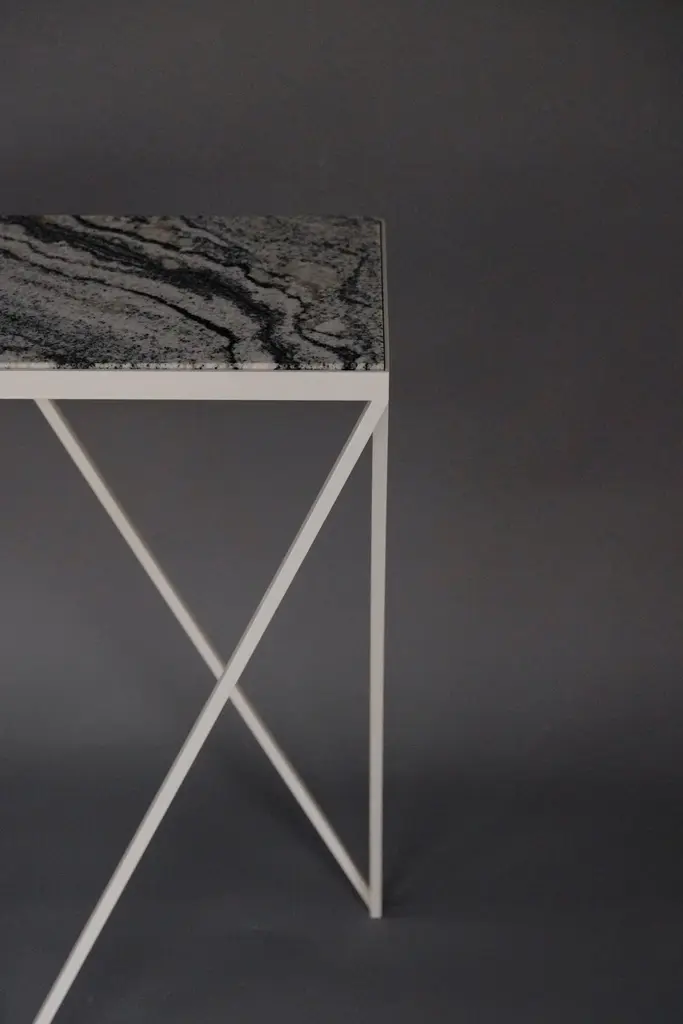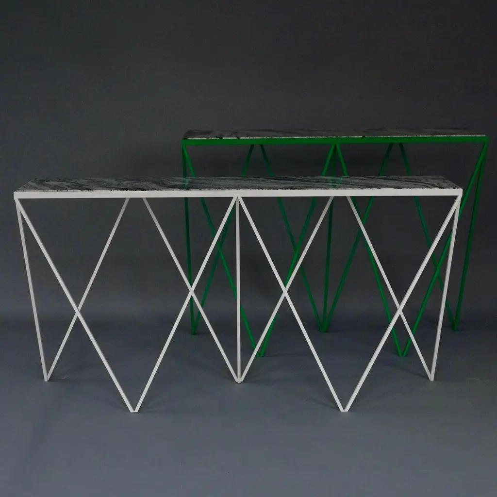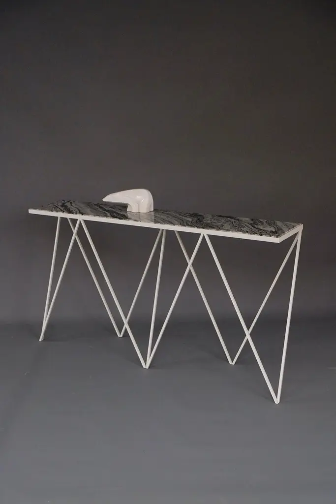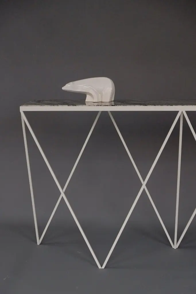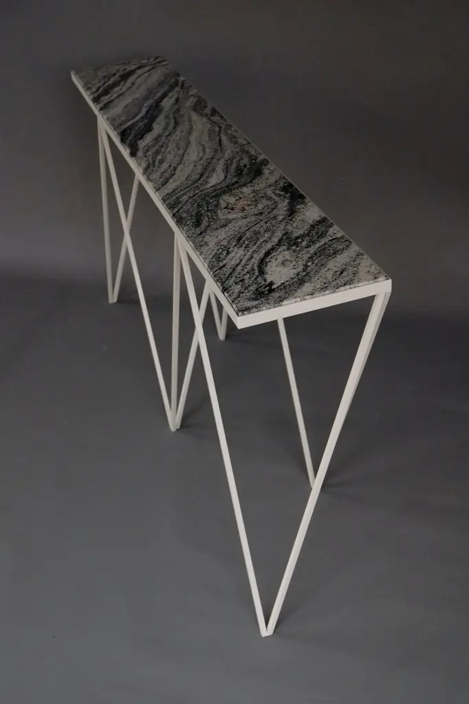 The Giraffe console table is a modern statement piece. The powder-coated steel console table looks stunning behind the sofa or in the hallway with a bunch of flowers or as a lamp table in any room. The beauty of the Giraffe console table is that it works both against period details and modern surroundings due to its elegant proportions. The Giraffe console table is made with a steel frame and a solid granite top. The geometric leg design ensures that the table is sturdy and stable maintaining an elegant aesthetic. Please get in touch if you have any specific stones you'd like us to source.The Giraffe console hold the Design Guild Mark for outstanding design and quality.Colour samples available to order from our storefront - LU2894331610202 The console is available in fifteen powder-coated colours with a wide choice of granite top finishes. All &New products are manufactured in Britain in small batches and hand-finished. We believe in local manufacturing. Our furniture is hand made to a high standard. The result is a collection of modern British furniture that celebrates those little imperfections that make objects beautiful and unique.Measures: 137cm wide, 25cm deep, 73cm high.Mirka & Jo&New - Modern British FurnitureZig-zag-legs/ Registered design. Community design registration number: 002391813-0001.