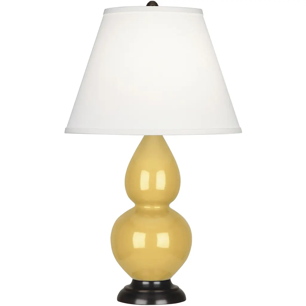 Egg Blue Glazed Ceramic With Deep Patina Bronze Finished Accents Small Double Gourd Accent Lamp With Pearl Dupioni Fabric Shade - Our Double Gourd collection features a simple but gracefully curving silhouette. Available in a wide array of vibrant colors and several different base finishes.