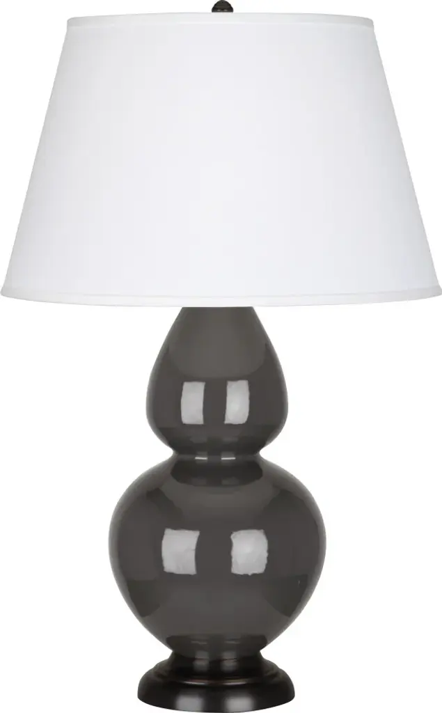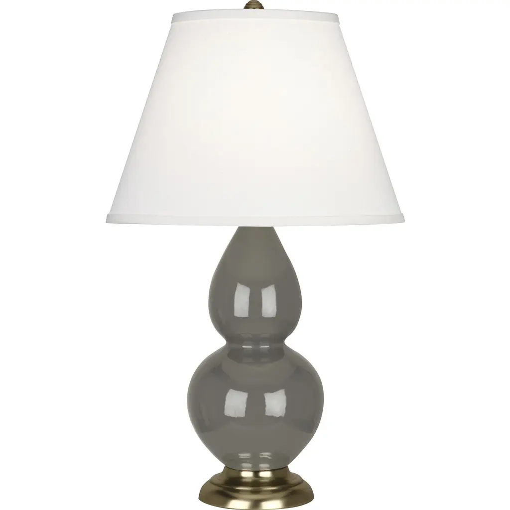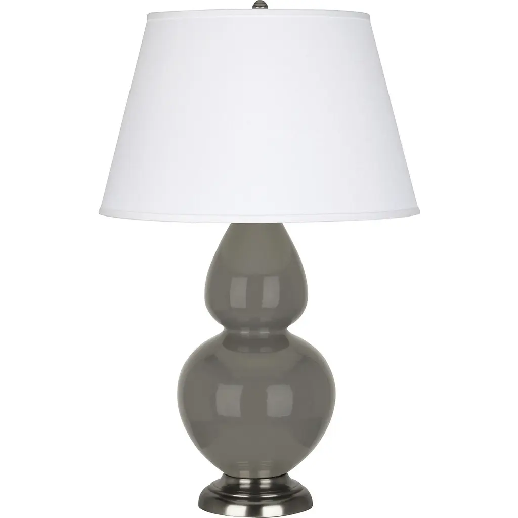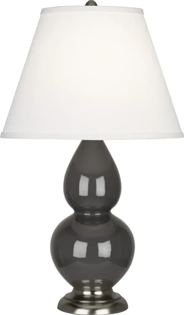 Ash Small Double Gourd Contemporary Accent LampFeaturesNumber of bulb: 1Bulb type: AMax wattage: 150WVoltage: 120VSocket: Medium E26Switch: 3-WaySwitch location: SocketFinish: Ash Glazed Ceramic with Antique Brass AccentsShade: Pearl Dupioni Fabric ShadeCord color: SilverUL listed: DryDimensionsShade dimensions: 7 inches top x 13 inches bottom x 9.5 inches down sideBase dimensions: 1.63 inches height x 5.25 inches width x 5.25 inches depth