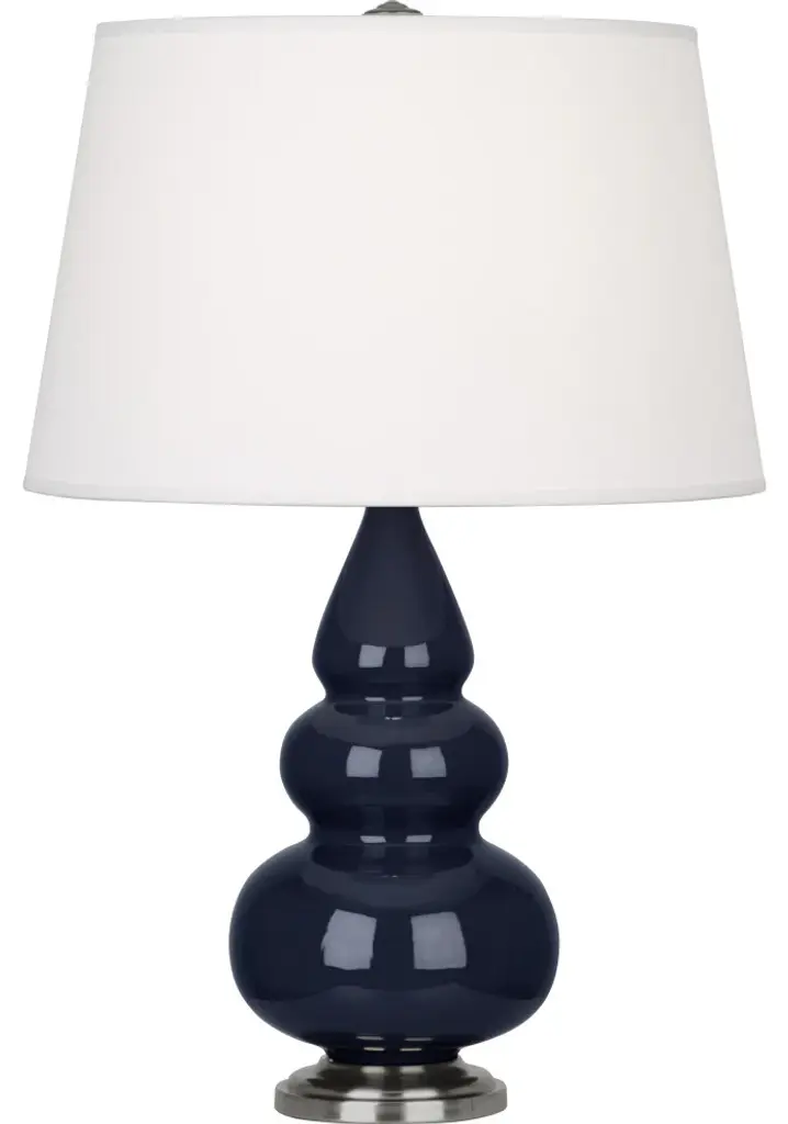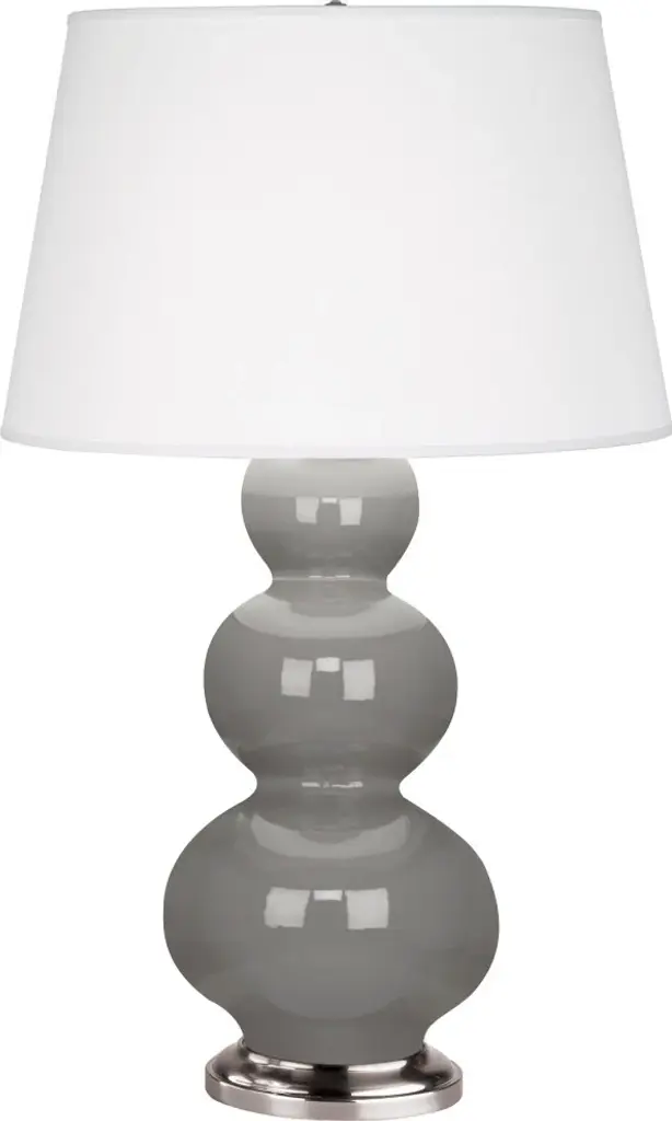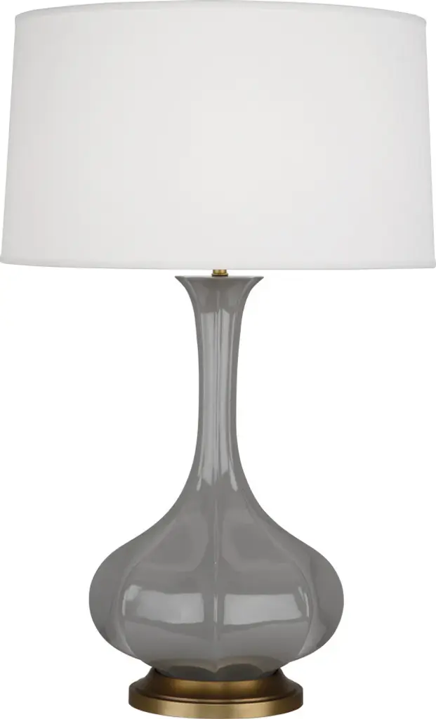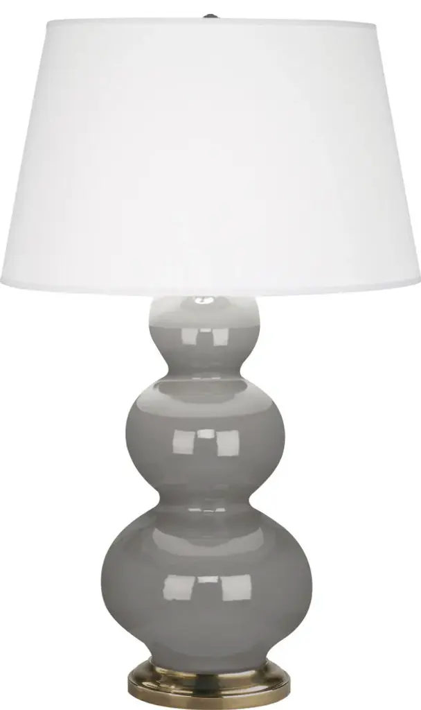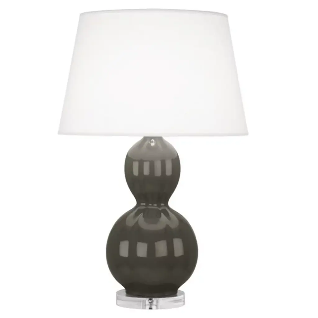 Ash Small Double Gourd Contemporary Accent LampFeaturesNumber of bulb: 1Bulb type: AMax wattage: 150WVoltage: 120VSocket: Medium E26Switch: 3-WaySwitch location: SocketFinish: Ash Glazed Ceramic with Antique Brass AccentsShade: Pearl Dupioni Fabric ShadeCord color: SilverUL listed: DryDimensionsShade dimensions: 7 inches top x 13 inches bottom x 9.5 inches down sideBase dimensions: 1.63 inches height x 5.25 inches width x 5.25 inches depth