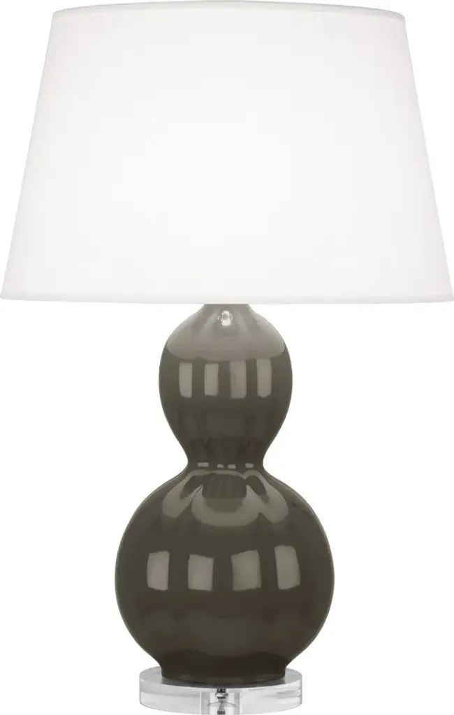 Ash Small Double Gourd Contemporary Accent LampFeaturesNumber of bulb: 1Bulb type: AMax wattage: 150WVoltage: 120VSocket: Medium E26Switch: 3-WaySwitch location: SocketFinish: Ash Glazed Ceramic with Antique Silvered AccentsShade: Pearl Dupioni Fabric ShadeCord color: SilverUL listed: DryDimensionsShade dimensions: 7 inches top x 13 inches bottom x 9.5 inches down sideBase dimensions: 1.63 inches height x 5.25 inches width x 5.25 inches depth