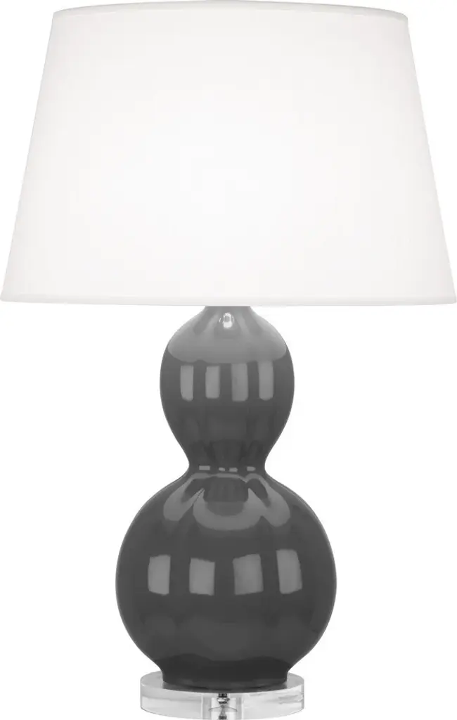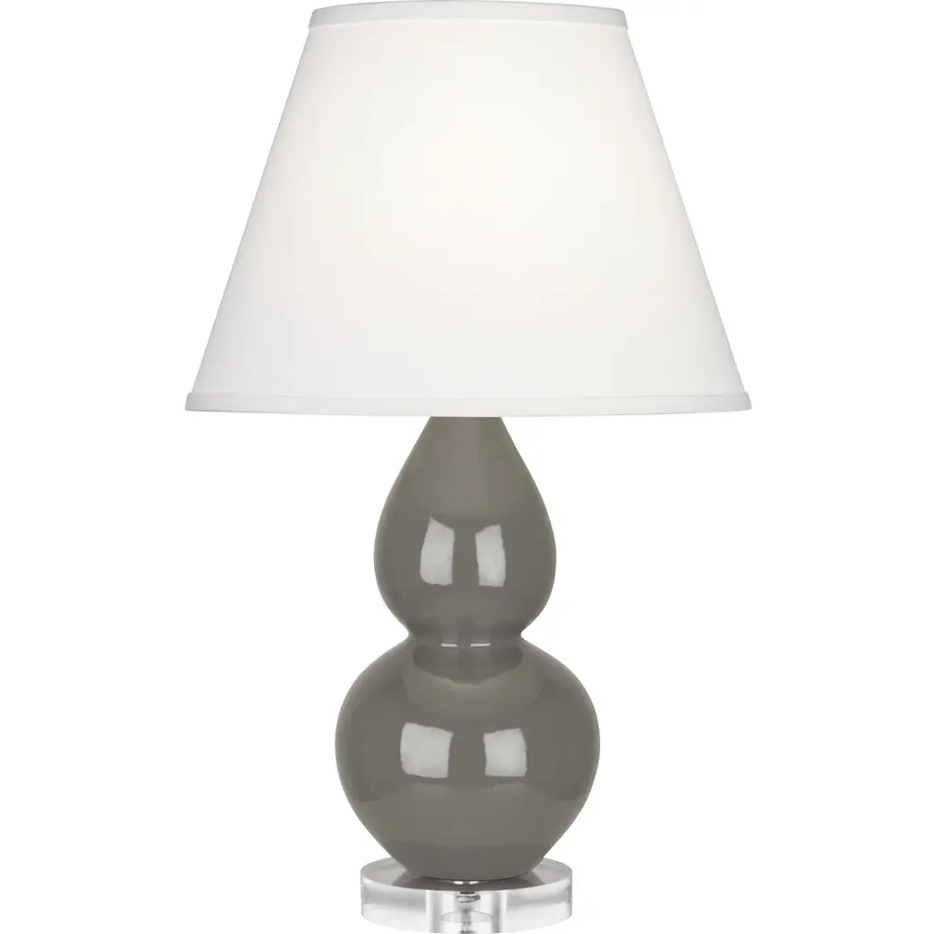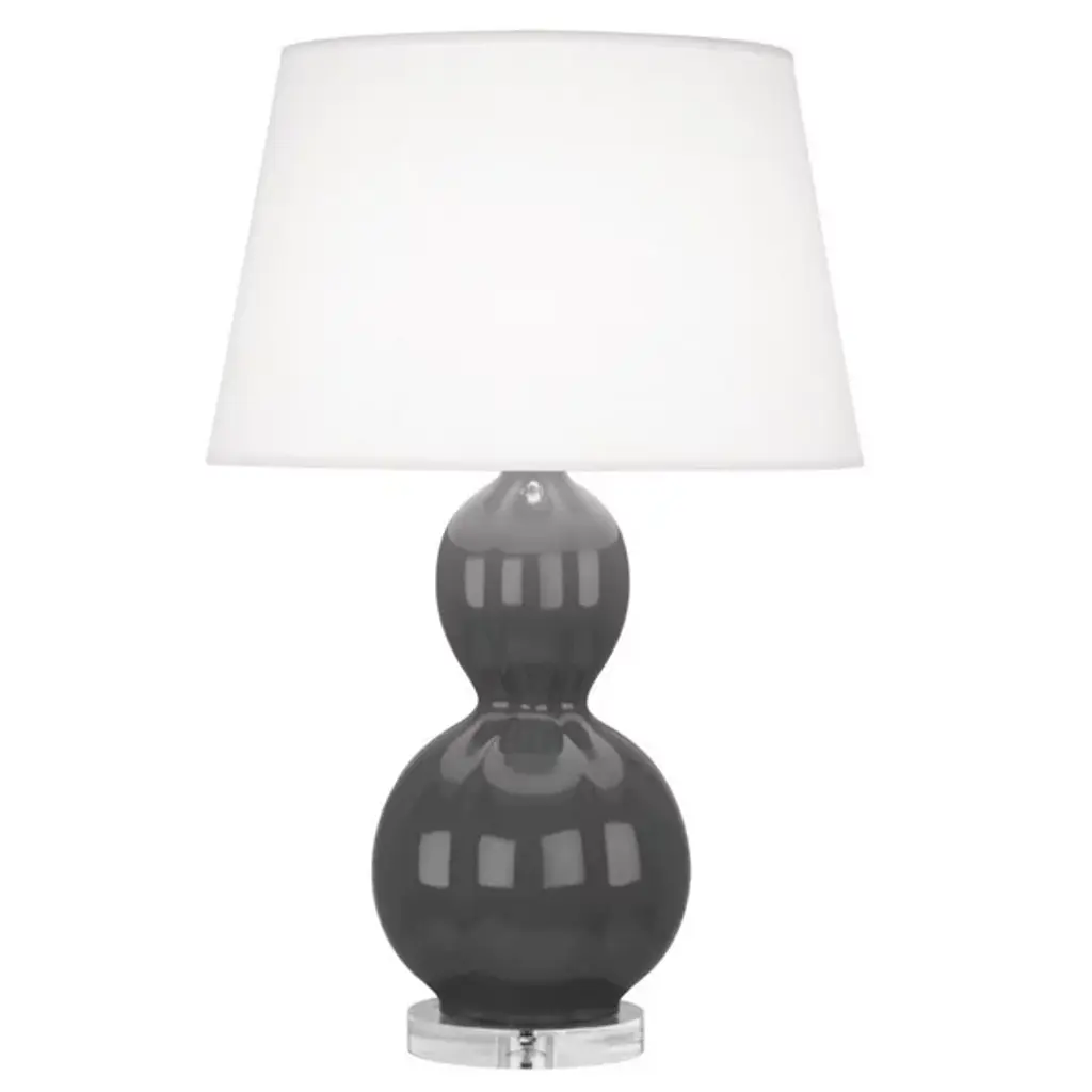 Ash Small Double Gourd Contemporary Accent LampFeaturesNumber of bulb: 1Bulb type: AMax wattage: 150WVoltage: 120VSocket: Medium Aluminum Sheet E26Switch: 3-WaySwitch location: SocketFinish: Ash Glazed Ceramic with Lucite BaseShade: Pearl Dupioni Fabric ShadeCord color: SilverUL listed: DryDimensionsShade dimensions: 7 inches top x 13 inches bottom x 9.5 inches down sideBase dimensions: 1 inch height x 5 inches width x 5 inches depth