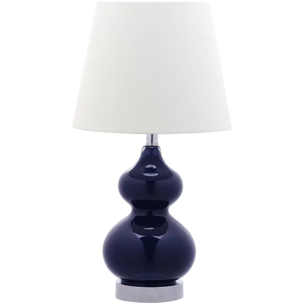 Midnight Small Double Gourd Contemporary Accent LampFeaturesNumber of bulb: 1Bulb type: AMax wattage: 150WVoltage: 120VSocket: Medium E26Switch: 3-WaySwitch location: SocketFinish: Midnight Blue Glazed Ceramic with Deep Patina Bronzed AccentsShade: Pearl Dupioni Fabric ShadeCord color: SilverUL listed: DryDimensionsShade dimensions: 7 inches top x 13 inches bottom x 9.5 inches down sideBase dimensions: 1.63 inches height x 5.25 inches width x 5.25 inches depth