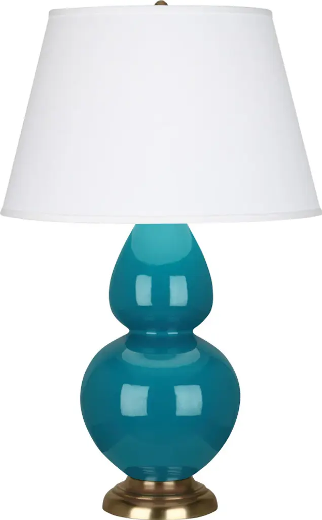 Peacock Small Double Gourd Contemporary Accent LampFeaturesNumber of bulb: 1Bulb type: AMax wattage: 150WVoltage: 120VSocket: Medium E26Switch: 3-WaySwitch location: SocketFinish: Peacock Glazed Ceramic with Deep Patina Bronzed AccentsShade: Pearl Dupioni Fabric ShadeCord color: SilverUL listed: DryDimensionsShade dimensions: 7 inches top x 13 inches bottom x 9.5 inches down sideBase dimensions: 1.63 inches height x 5.25 inches width x 5.25 inches depth