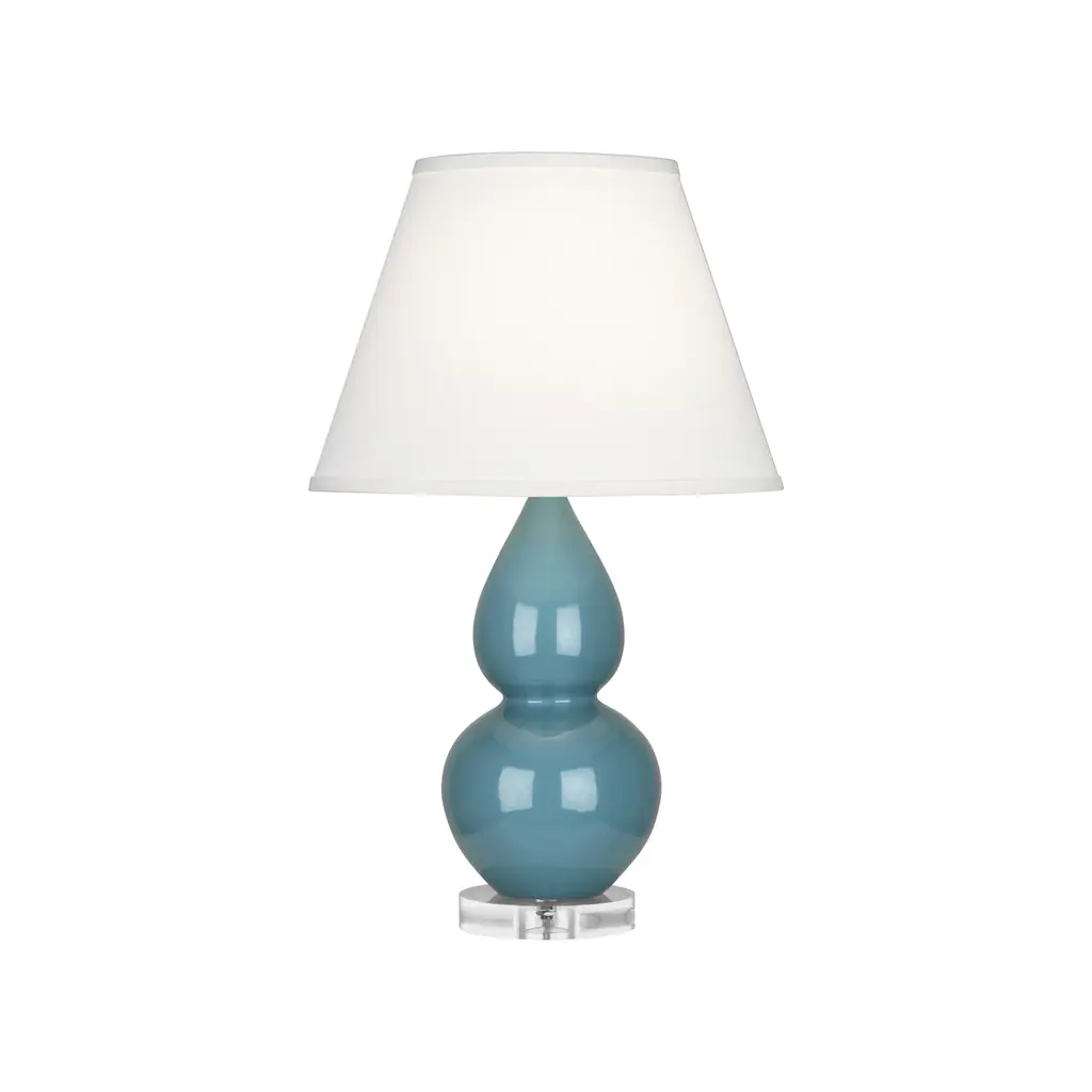Steel Blue Small Double Gourd Contemporary Accent LampFeaturesNumber of bulb: 1Bulb type: AMax wattage: 150WVoltage: 120VSocket: Medium E26Switch: 3-WaySwitch location: SocketFinish: Steel Blue Glazed Ceramic with Antique Brass AccentsShade: Pearl Dupioni Fabric ShadeCord color: SilverUL listed: DryDimensionsShade dimensions: 7 inches top x 13 inches bottom x 9.5 inches down sideBase dimensions: 1.63 inches height x 5.25 inches width x 5.25 inches depth
