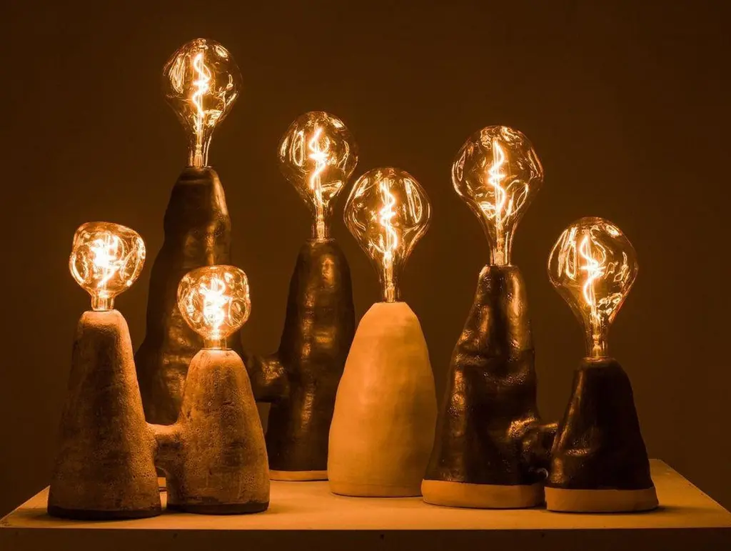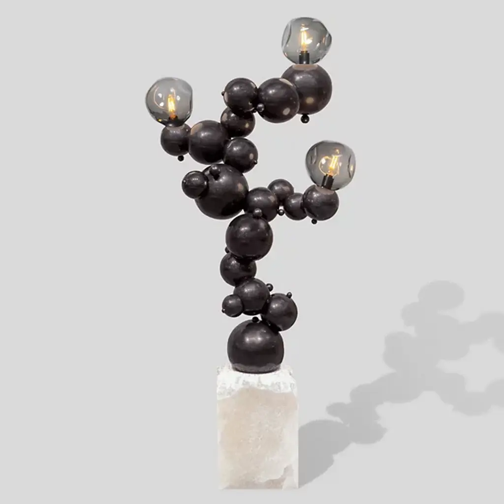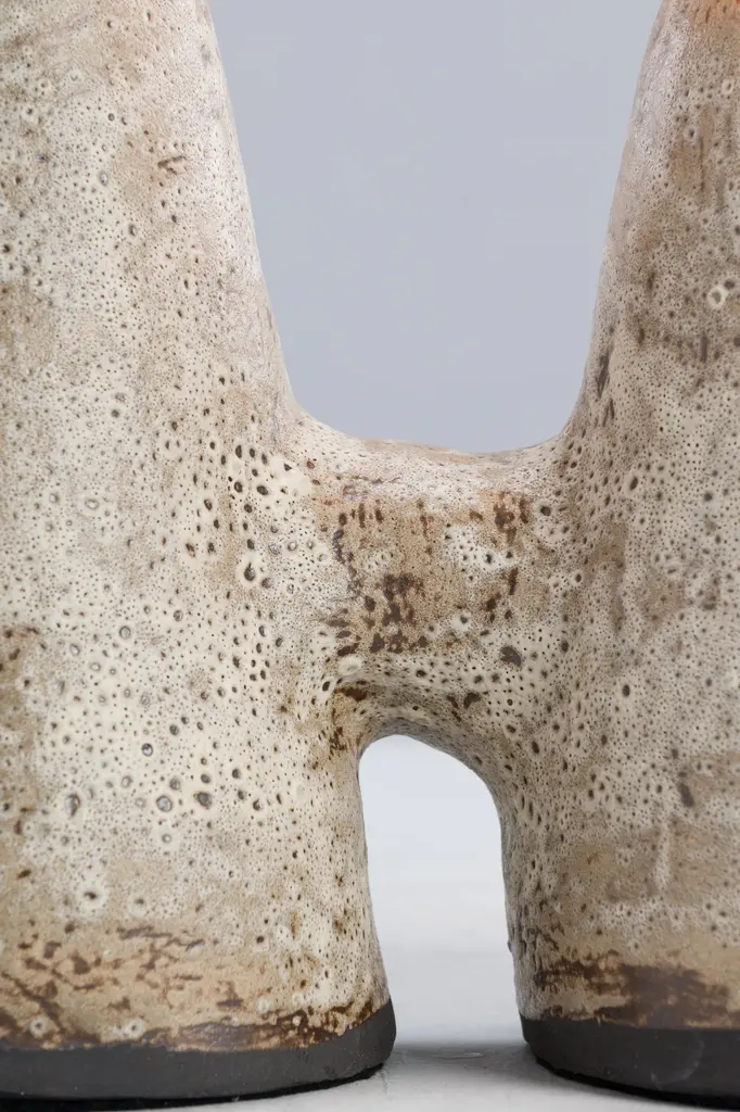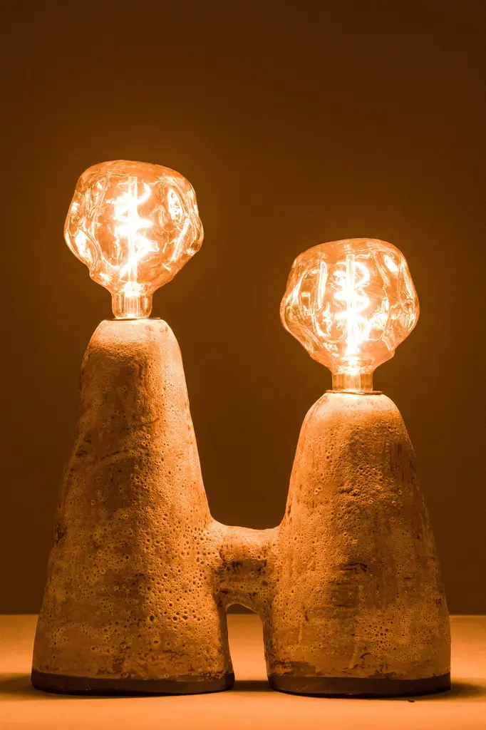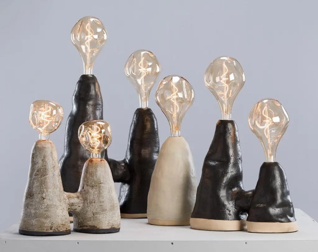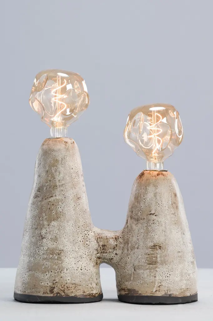 Small double lamp by Sophie RogersDimensions: D 40 x H 35 (base only) / 45 (with bulb) cmMaterials: black stoneware, matte cream glaze, aged brassBulb spec: 6W, E27, 340 Lumens, dimmableWhite stoneware and black glaze also available.All our lamps can be wired according to each country. If sold to the USA it will be wired for the USA for instance.Nottingham - based ceramicist Sophie Roger designs and handcrafts sculptural lighting and homewares from her home studio.Her practice centres around the ancient Japanese carving method of Kurinuki, and adaptations on the technique personal to Sophie’s work has enabled her to create large scale sculptural, functional pieces.Sophie’s practice is heavily Material driven, with instinctual making and organic materials at its core. Drawing influence from geological and natural features, she looks to design products that maintain elegance and simplicity, whilst demonstrating a level of skill and complexity with scale.The process allows Sophie to hand Craft bespoke pieces that are different every time for the home, contemporary Craft, and contemporary design gallery markets.