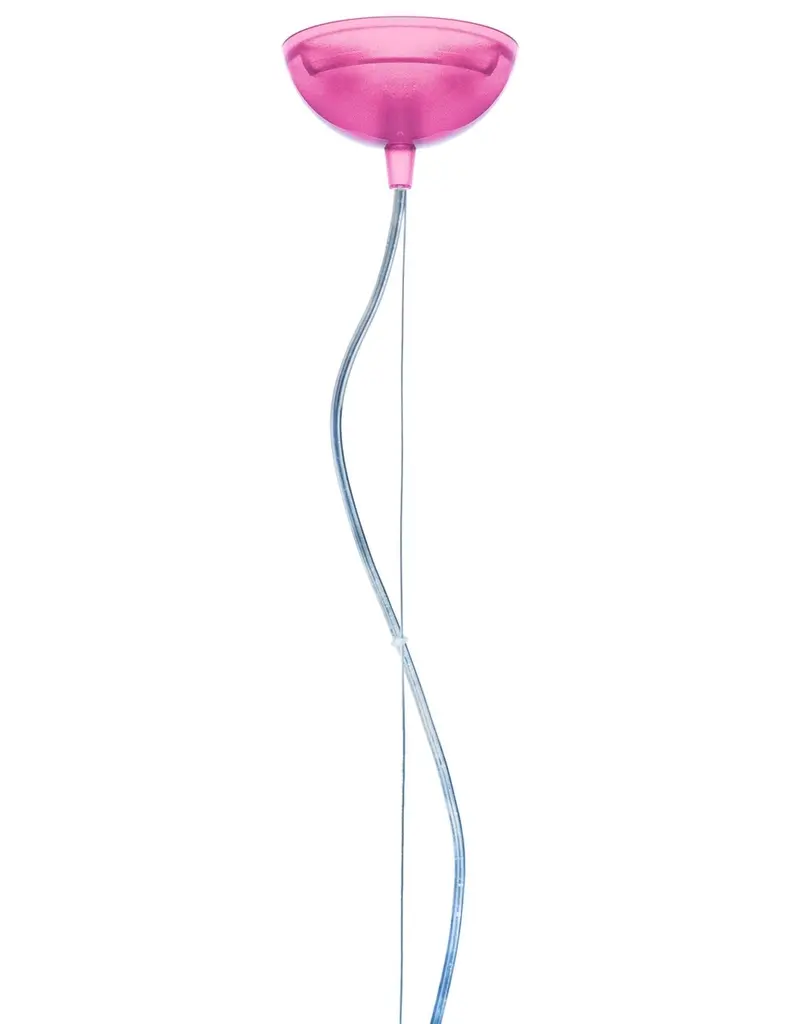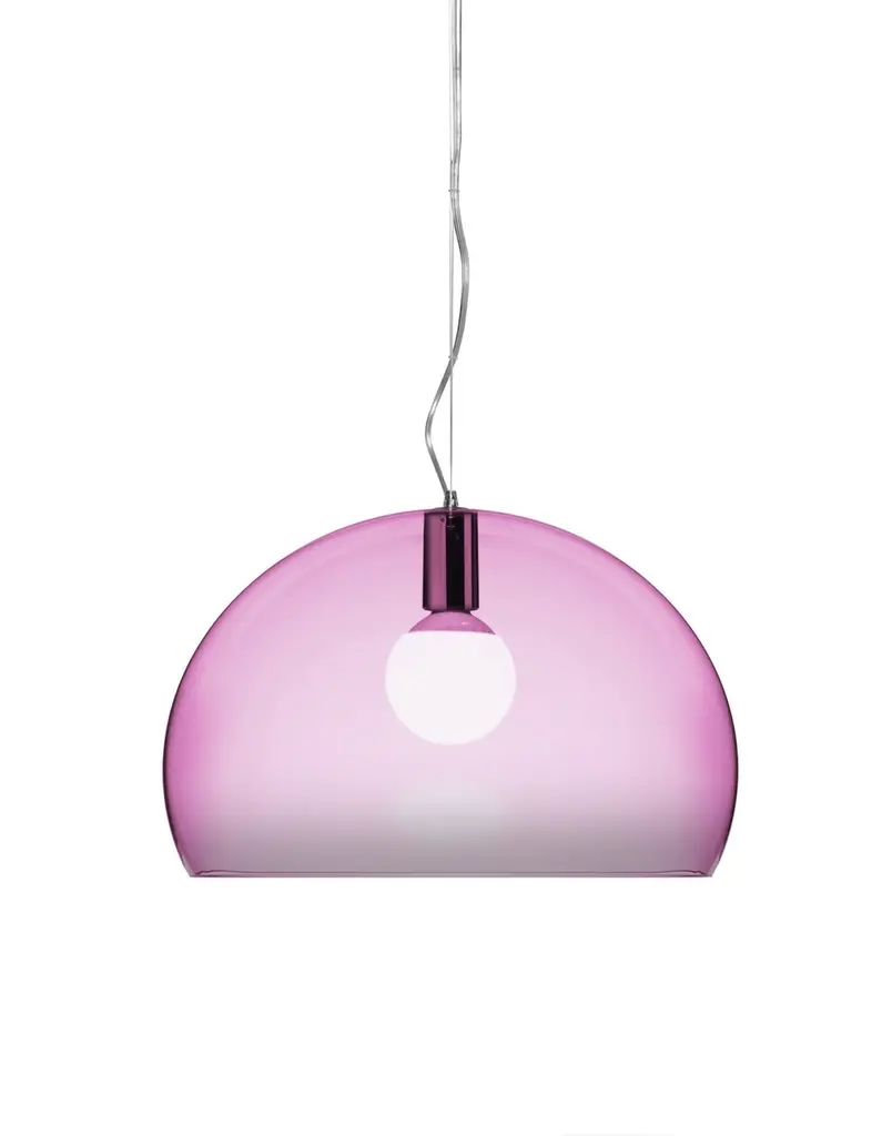 FL/Y is an essentially-styled suspension lamp. The particular transparency of the material and the sheen of the colours recreate the idea of a soap bubble, shimmering iridiscently in the light. The shade is not perfectly hemispherical, with the cut-off falling just below the level of the diameter, offering greater concentration of the light. The lamp is available in three different sizes: Fl/Y (diameter 52cm, shade depth 33cm), Small Fl/Y (diameter 38cm, shade depth 28cm) and Big Fl/Y (diameter 83cm, shade depth 55cm).