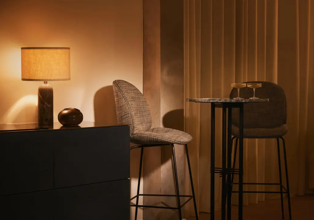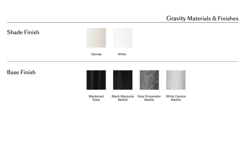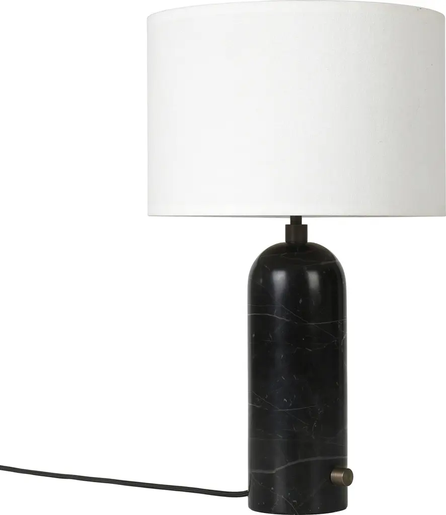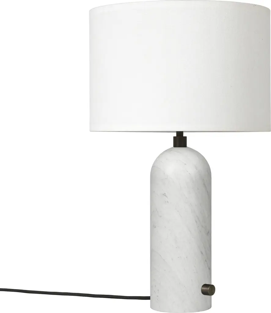 Small 'Gravity' marble table lamp by Space Copenhagen for Gubi in White.Executed in solid marble with a canvas or white textile shade perched atop its stem, the Gravity table lamp designed by Space Copenhagen for GUBI contrasts strength and fragility. The lamp has a distinctive balance between the heavy, cylindrical base and the lightweight, airy shade that beautifully merges into a sculptural whole. The lamp casts an ambient light while serving as statement piece in any room.Established in 2005 by Signe Bindslev Henriksen and Peter Bundgaard Rützou, Space Copenhagen is a design studio working across multiple disciplines from furniture, lighting and refined objects, to art installations, art direction and interior design for private homes, hotels and restaurants all over the world.Price is per item. Available in unlimited quantities in choice of blackened steel base or marble base in black, gray, or white. Choice of white textile or canvas shade. This listing is for the small table lamp with white marble base; please specify shade type when ordering.Accommodates 1x 60W equivalent standard medium base (e26) LED bulb (lower with incandescent). UL listed.In-stock lead time 2-3 weeks. For out of stock orders, add an additional 2-3 weeks or more. Can take up to 10 weeks or more. Inventory availability subject to change at any time. Made to order. All sales are final. Please note that marble can vary from item to item due to the organic nature of the material.