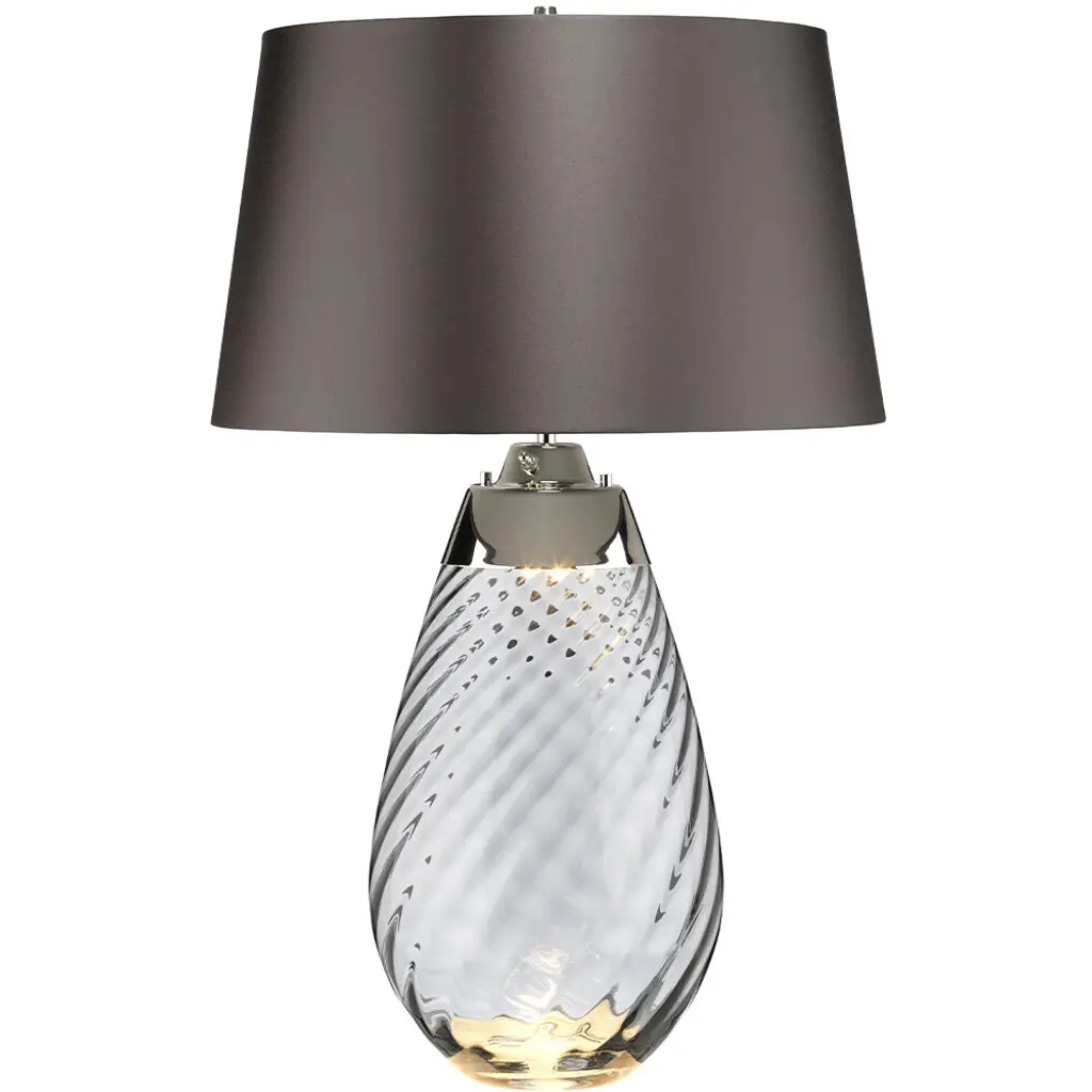 Small wavy textured blown glass table lamp with a Blue tint and Polished Nickel metalwork. This dual-lit table lamp has a 4-way switch to light both the shade and the base. Includes a Slate satin shade with matte silver laminate lining