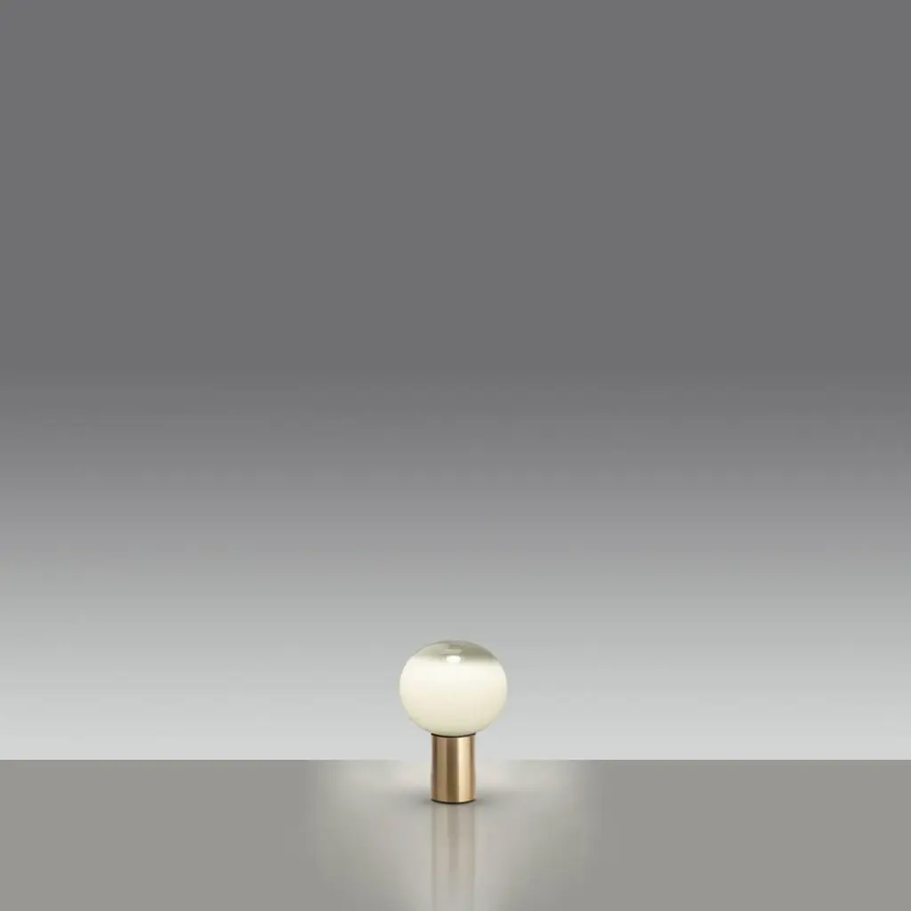 Small Mattheo Thun 'Laguna 16' glass and gold metal table lamp for Artemide. Executed in hand blown milky white glass with a crystal finish at the top and perfectly mounted atop a gold painted aluminum base. According to Thun, "The lagoon of Venice was the main inspiration: Its fascinating atmosphere, its light and its mist. The character of the collection reflects its main material: hand blown glass from Venice”. As such, the Laguna's lyrical design casts a warm and softly diffused light in its surrounding environment.Price is per item. Available to order in unlimited quantities in three sizes as well as in choice of gold or bronze base - please see our separate listings. This listing is for the small Laguna 16 with a gold base.In stock lead time 1-2 weeks. Out of stock lead time can add an additional 10 weeks or more. Lead times subject to change without notice. Please contact us for current lead times prior to placing time-sensitive orders.Born in Italy in 1952, Matteo Thun co-founded the Memphis Design movement in 1981. Having trained as an architect, his practice promotes designs which are simple in appearance but complex in meaning. The winner of many awards, in 2004 he was inducted into the Interior Design Hall of Fame.Accommodates a single candelabra (E12) base LED bulb with a maximum 60Watt Equivalent (bulb not included). Powered by black cord with integrated on/off switch. This lamp is IP20 rated and UL listed.Made to order.All sales final.