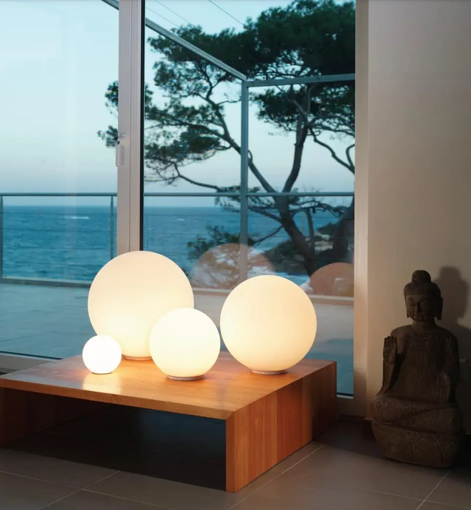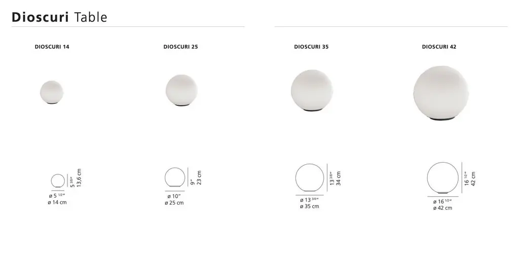 Small Michele De Lucchi 'Dioscuri 14' table lamp for Artemide. 'Dioscuri' is a timeless fixture that diffuses a heavenly light. This multipurpose lamp features a minimalistic design that transcends time with its charm. Executed in hand-blown acid-etched white glass with a hidden thermoplastic resin base.Price is per item. Available to order in unlimited quantities and in four sizes. Also available as a indoor/outdoor wall or ceiling lamp - please see our separate listings. This listing is for the smalle 'Dioscuri 14' table lamp.In stock and available for immediate fulfillment. Out of stock lead time can take 8 weeks or longer. Please note that inventory and lead time are subject to change and without notice. Please contact us for current lead time prior to placing time-sensitive orders.Illuminated by 1x E14 candelabra base dimmable LED bulb with a maximum 40Watt Equivalent (bulb not included). IP20 rated and UL listed.Made to order. All sales final.