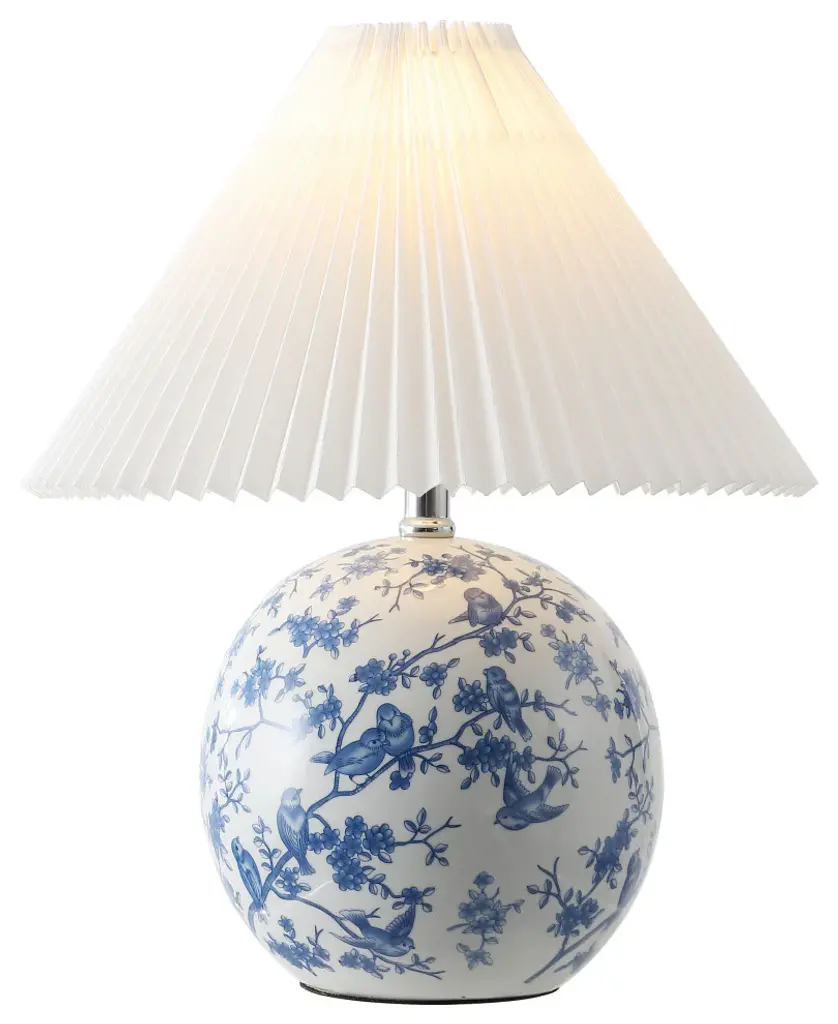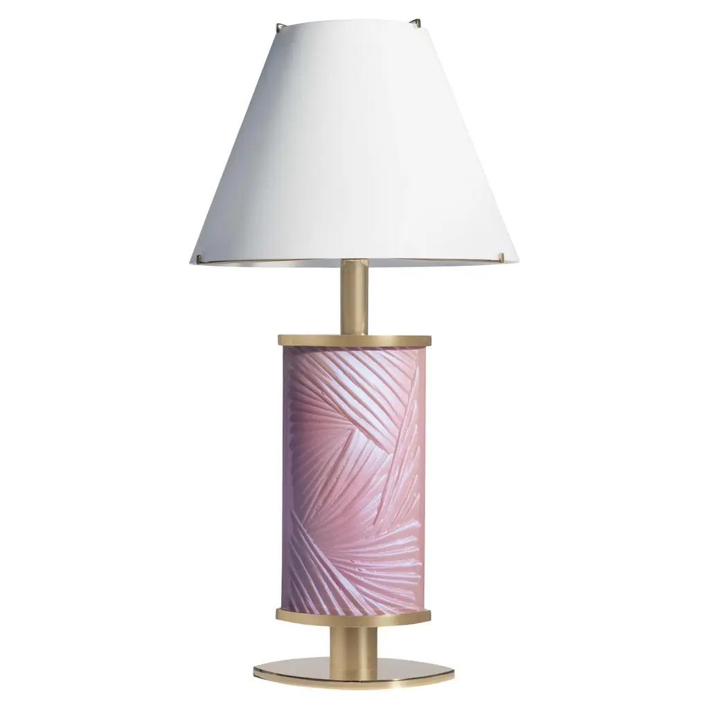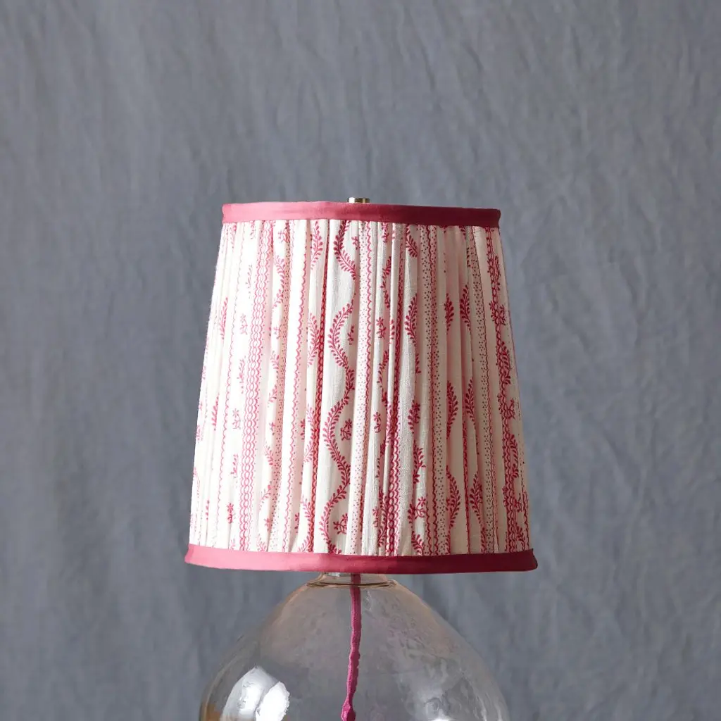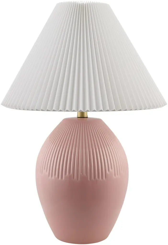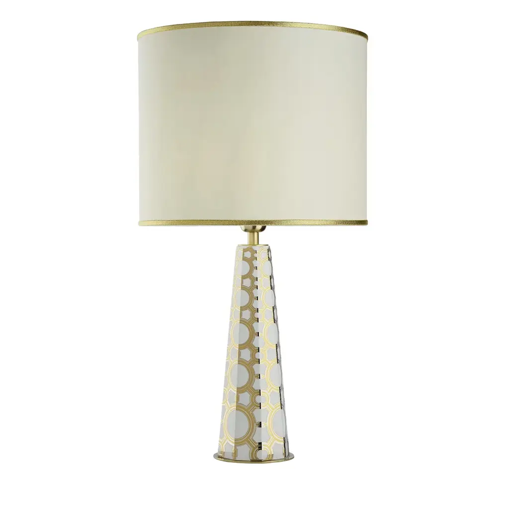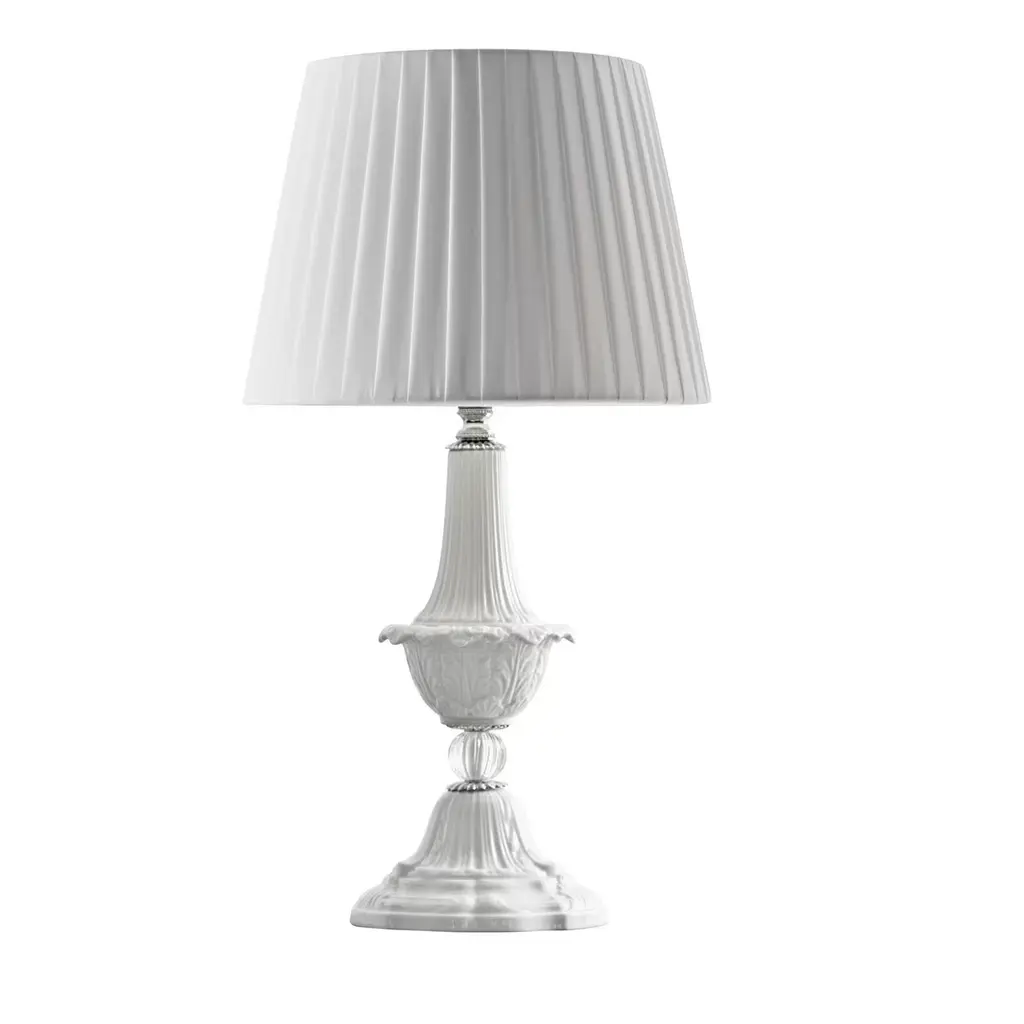 This refined table lamp displays a bulging porcelain body enriched by a gray pattern of vertical stripes with rounded edges and graceful floral motives. The pleated fabric lampshade houses a single E27 max 60W bulb diffusing a soft light that lights up the golden details of the porcelain base.