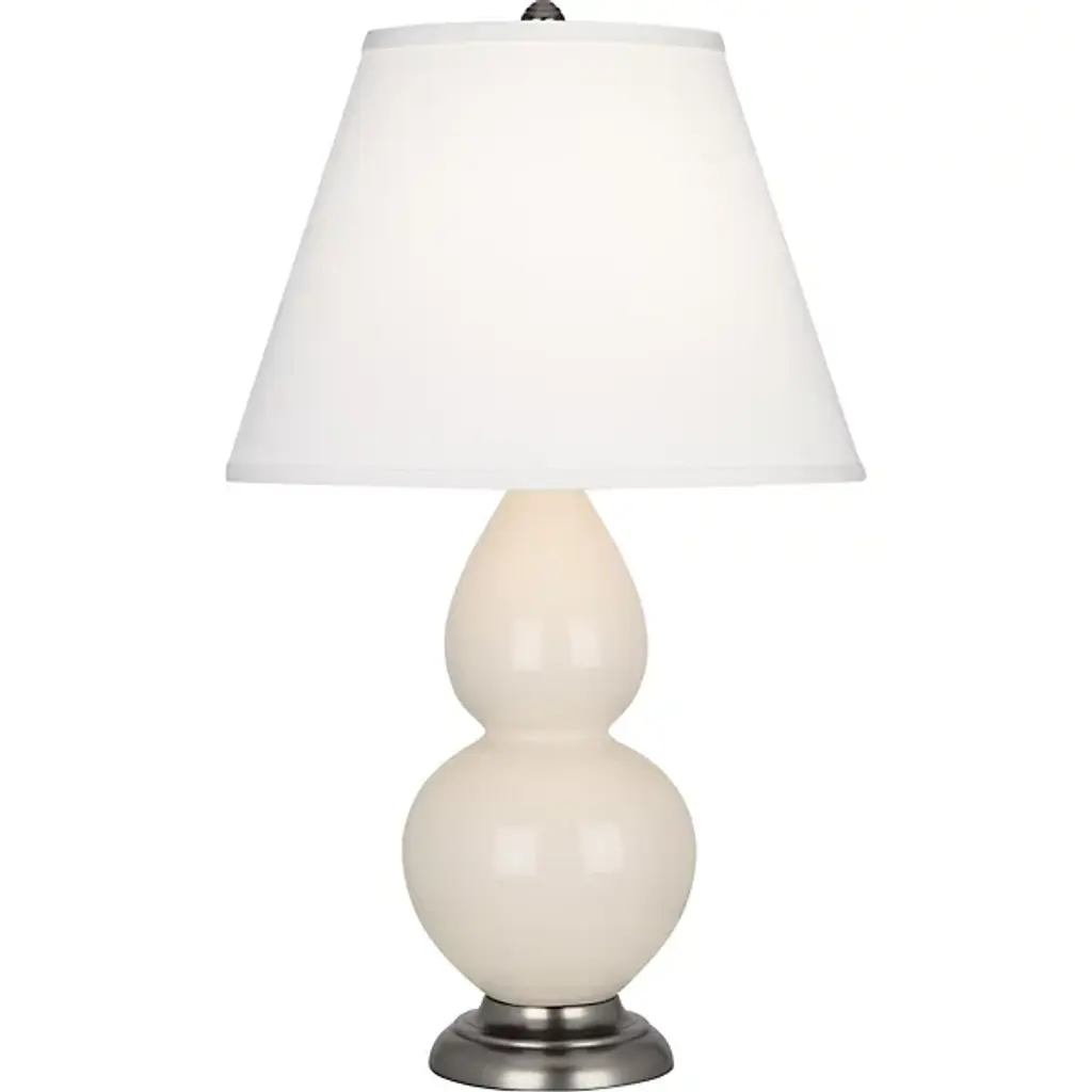 Bone Small Triple Gourd Contemporary Accent LampFeaturesNumber of bulb: 1Bulb type: AMax wattage: 150WVoltage: 120VSocket: Medium Aluminum Sheet E26Switch: 3-Way RotarySwitch location: SocketFinish: Bone Glazed Ceramic with Lucite BaseShade: Pearl Dupioni Fabric ShadeCord color: SilverUL listed: DryDimensionsShade dimensions: 12.75 inches top x 16 inches bottom x 10 inches down sideBase dimensions: 1 inch height x 5.5 inches width x 5.5 inches depth
