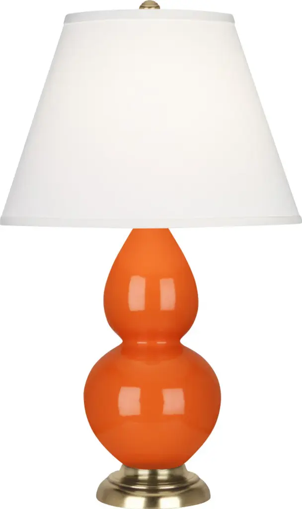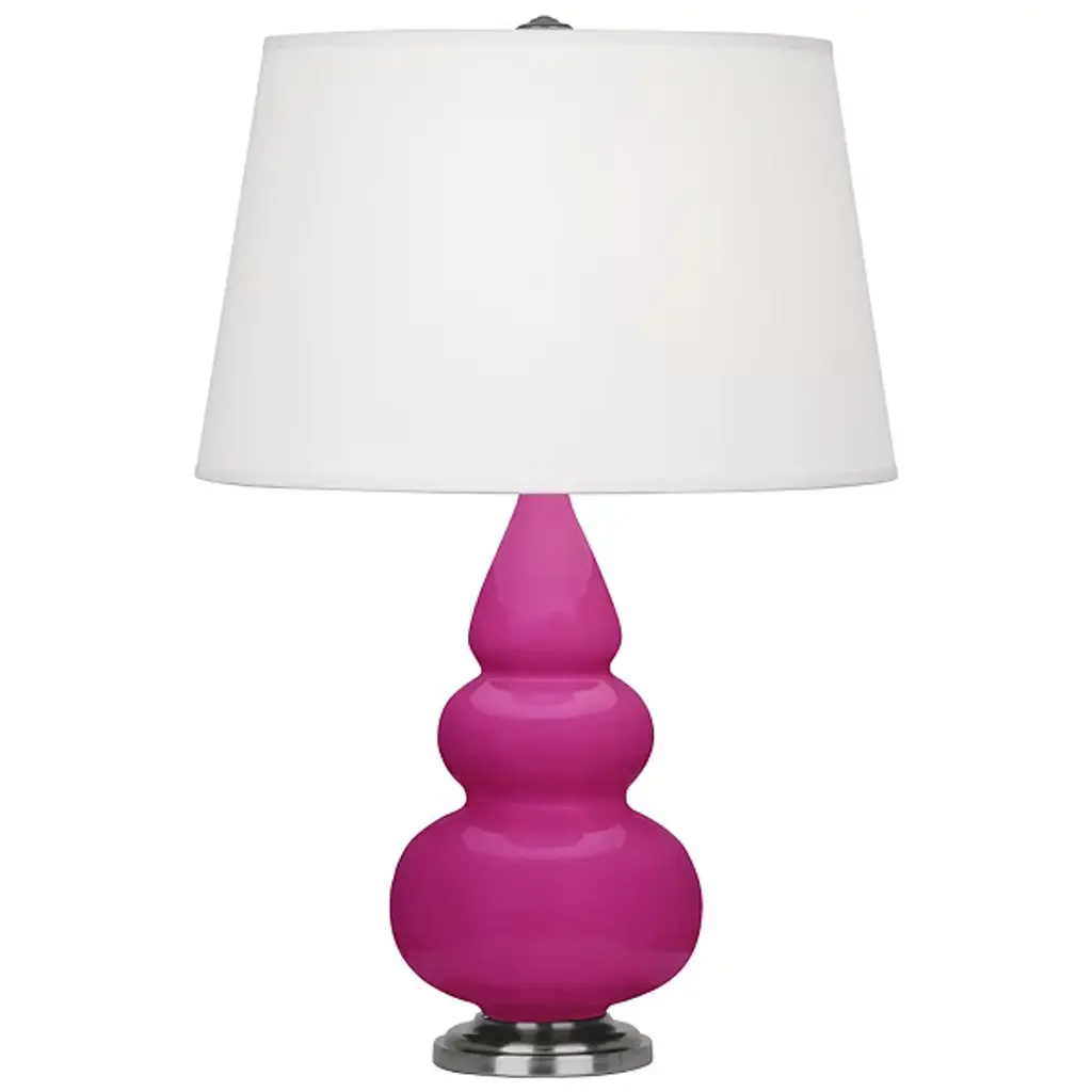 Ruby Red Small Triple Gourd Contemporary Accent LampFeaturesNumber of bulb: 1Bulb type: AMax wattage: 150WVoltage: 120VSocket: Medium E26Switch: 3-Way RotarySwitch location: SocketFinish: Ruby Red Glazed Ceramic with Antique Silvered AccentsShade: Pearl Dupioni Fabric ShadeCord color: SilverUL listed: DryDimensionsShade dimensions: 12.75 inches top x 16 inches bottom x 10 inches down sideBase dimensions: 1.25 inches height x 5.13 inches width x 5.13 inches depth