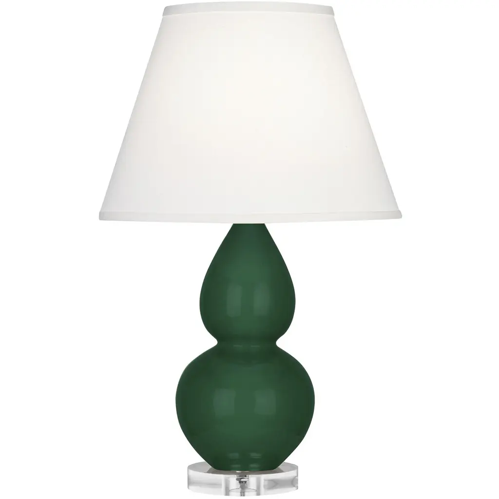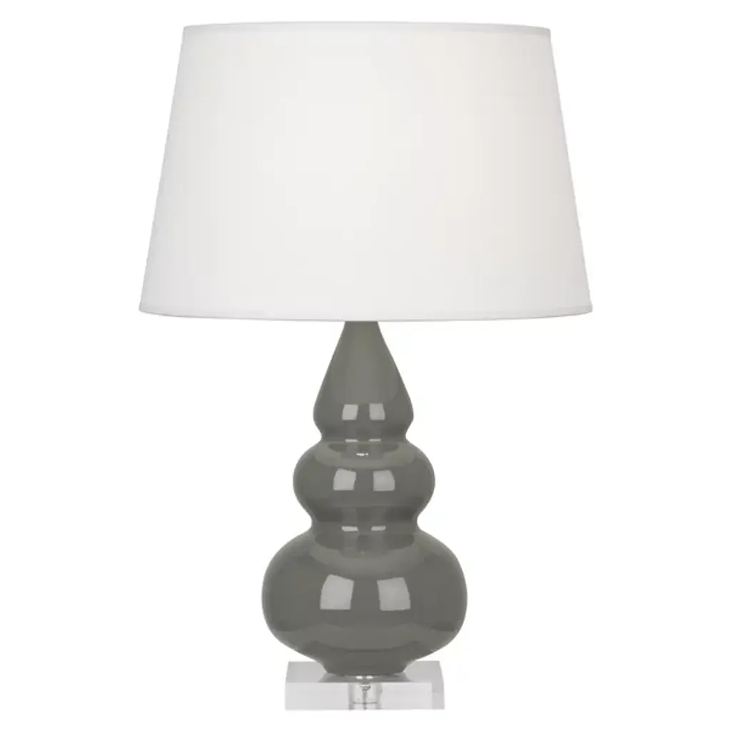 Graceful and delicate. The Small Triple Gourd Table Lamp by Robert Abbey provides beautiful illumination and adds to any interior space's visual intrigue. Its curved body that is reminiscent of the sinuous shape of a gourd is crafted from glazed ceramic for a polished look. This fixture is topped with a tapering lampshade that is made of dupioni fabric and houses a medium base incandescent lamp (sold separately), that delivers both task lighting and ambient glow. Infuse a modern touch to living spaces, bedrooms, or offices with this fixture.