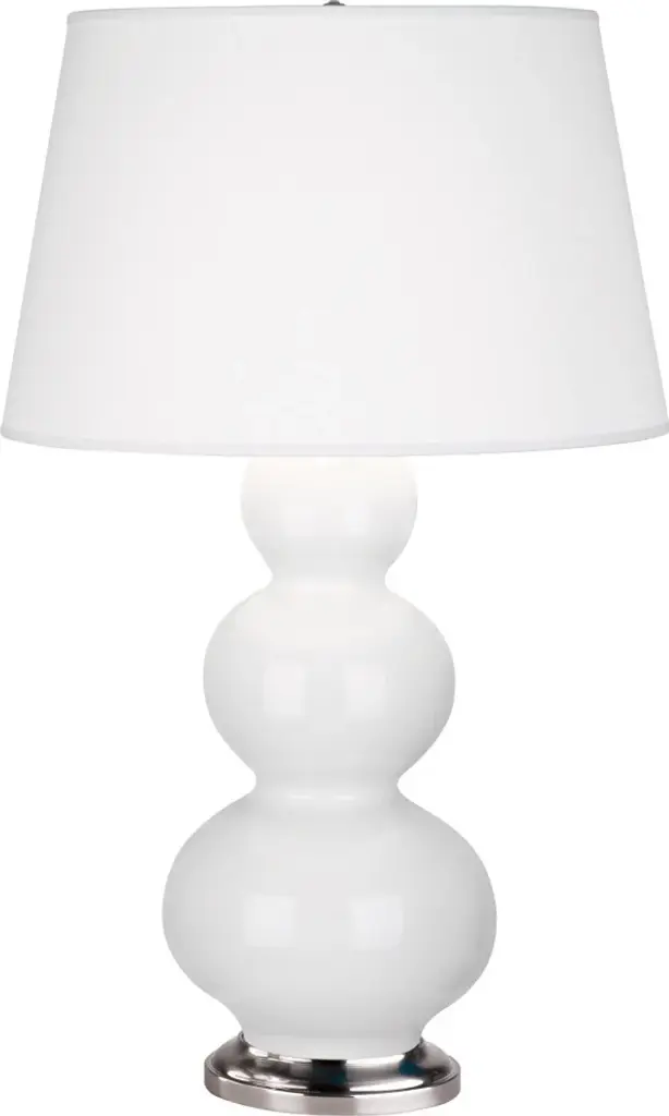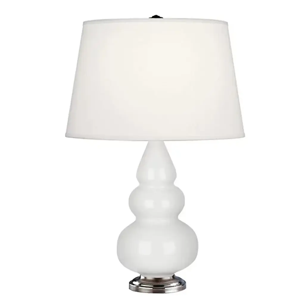 Graceful and delicate. The Small Triple Gourd Table Lamp by Robert Abbey provides beautiful illumination and adds to any interior space's visual intrigue. Its curved body that is reminiscent of the sinuous shape of a gourd is crafted from glazed ceramic for a polished look. This fixture is topped with a tapering lampshade that is made of dupioni fabric and houses a medium base incandescent lamp (sold separately), that delivers both task lighting and ambient glow. Infuse a modern touch to living spaces, bedrooms, or offices with this fixture.
