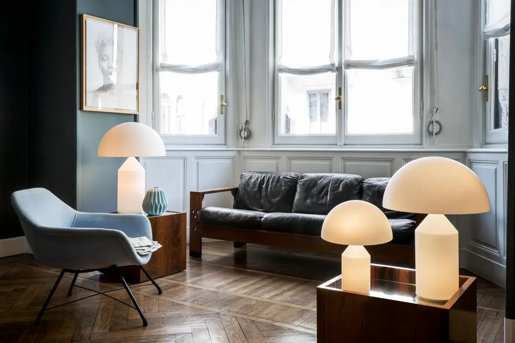 Small Vico Magistretti 'Atollo' opaline glass table lamp for Oluce. Originally designed in 1977, this iconic re-edition is still crafted by Oluce in Italy using many of the original manufacturing techniques with scrupulous attention to detail, materials and craftsmanship. Executed in blown opaline glass which casts a warm, diffuse light. The simple geometric silhouette of this clean design solidifies it as a timeless Italian icon.Price is per item. Available to order in unlimited quantities and in three sizes, please see our separate listings. Also available in satin bronze, sating gold, satin black nickel, white or black, please inquire for details. This listing is for the smallest lamp (13.8" height) in opaline glass.In-stock lead time 5-6 weeks. Out of stock lead time can add 7-8 weeks or more. Please note that inventory availability is subject to change without notice. Please inquire for current lead times prior to purchasing time-sensitive orders.Accommodates 2x maximum 40W equivalent candelabra e12 LED bulbs and 1x maximum 25W equivalent candelabra e12 LED bulb, with switch on the black cord. UL listed.Made to order. All sales are final.Please note that all Oluce items ship directly from the manufacturer, as such, 1stDibs shipping or local pickup is not an option.