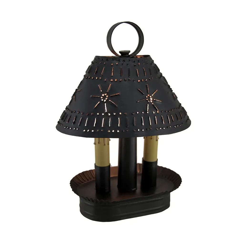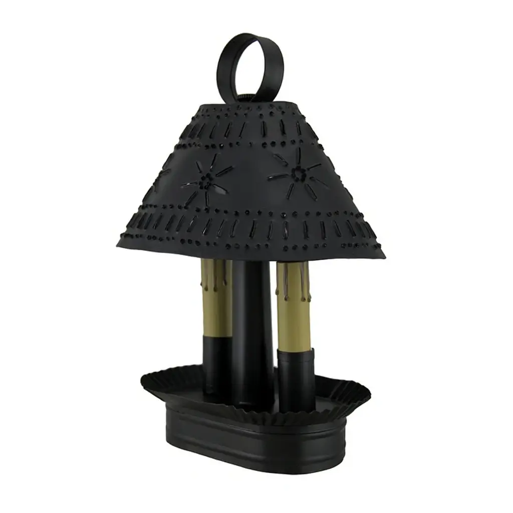 This sweet oval double candle socket lamp would be a beautiful welcome in the foyer, mudroom or anywhere throughout your home. Made of metal, it has hand-punched chisel accents and a smokey black finish. It features two candelabra sockets that can each handle up to a 60 watt bulb (not included). The lamp measures 12 inches tall, 7.5 inches wide and 6 inches deep. It is UL approved, and makes a great gift.
