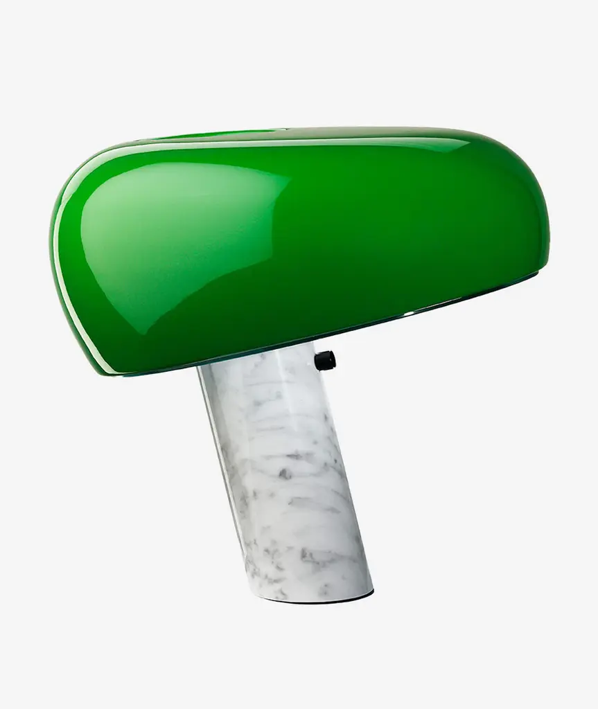 The playful personas of the Castiglioni brothers are evident in their marble Snoopy design, named for the beloved cartoon character and featuring a distinctive, light-hearted shape. The original debuted in 1967, and this version was reintroduced in 2003 with updated technology. The Snoopy modern desk lamp provides direct light through a thick glass disk and an enameled reflector, both resting in perfect balance on a white marble base. There is an integral dimmer and switch. Inspiration behind the design: With the Snoopy, brothers Achille and Pier Giacamo Castiglioni pay tribute to the sweet natured character by Charles M. Schulz.