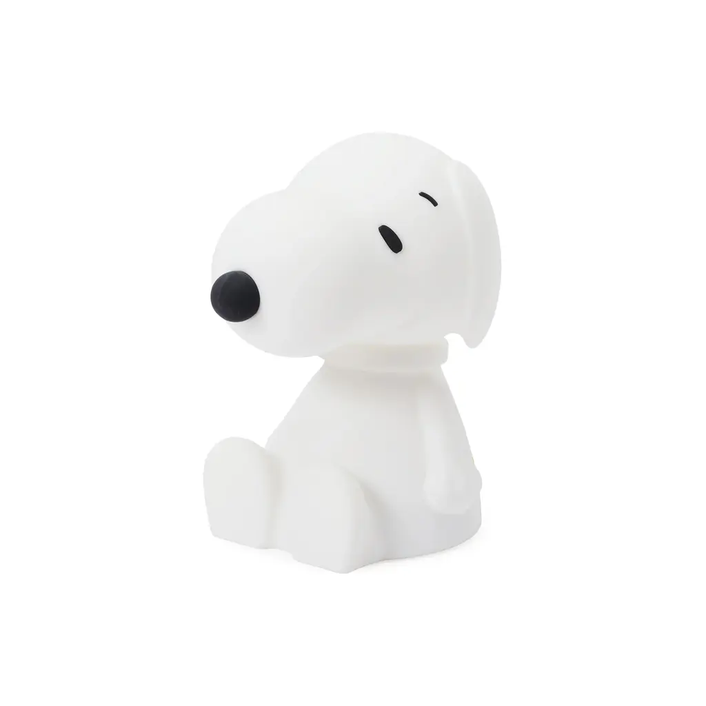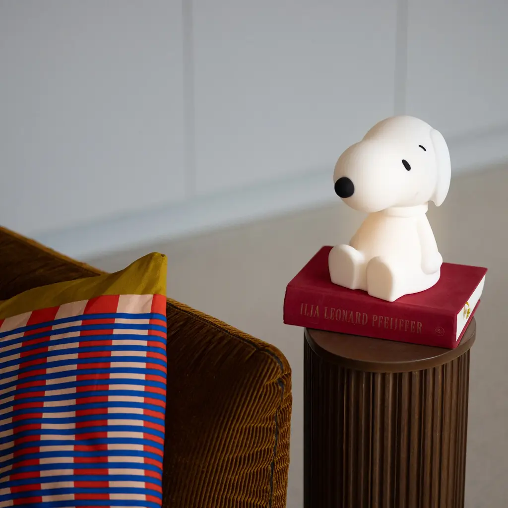 MoMA Exclusive: Designed to be the first lamp to light your child’s room, Snoopy First Light is based on Charles M. Schulz’s beloved beagle. Crafted from soft silicone, the lamp is a portable night light that emits a comforting, soft light. The LED light source is designed to be used for a full nighttime routine. Large and Small sizes sold separately. Ages 3+. Features of the Large Snoopy First Lamp include: Iconic Snoopy design. Wireless and portable. Made of soft silicone. Rechargeable and dimmable LED light source is designed to be used for a full nighttime routine. 6-step dimming via dimmer switch on bottom of lamp. Rechargeable by USB-C, the battery lasts 8-120 hours depending on the chosen brightness setting Measures 8.5h x 5.5w x 7.5"d. Feature of the Small Snoopy First Lamp include: Iconic Snoopy design. Wireless and portable. Made of soft silicone. Powers with 2 CRO232 batteries (included). Cozy warm LED light. Light automatically switches off after 15 minutes. Measures 4.4h x 3.25" diam. Uses for the Snoopy First Lights include: A cozy light for storytime. A safe night light when it's time to sleep. A gentle light during a night feed. A helpful light for a diaper change in the early hours.