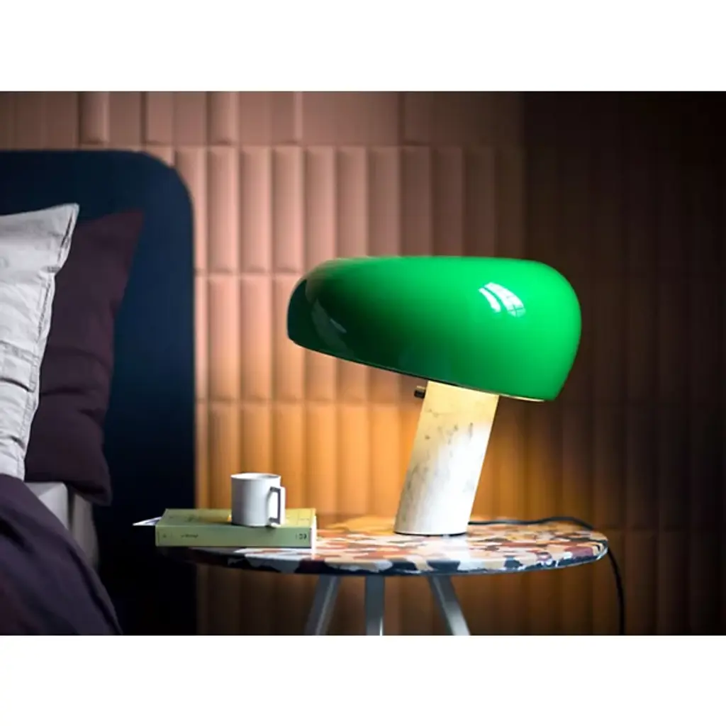 The FLOS Snoopy Table Lamp is the 2003 reintroduction of an original design by Achille and Pier Giacomo Castiglioni in 1967. The enameled shade comes in a variety of colors and works with a thick disc of glass to diffuse a bright wash of task lighting. This singular structure rests in perfect balance on the White marble base, which features an integral, user-friendly dimmer.