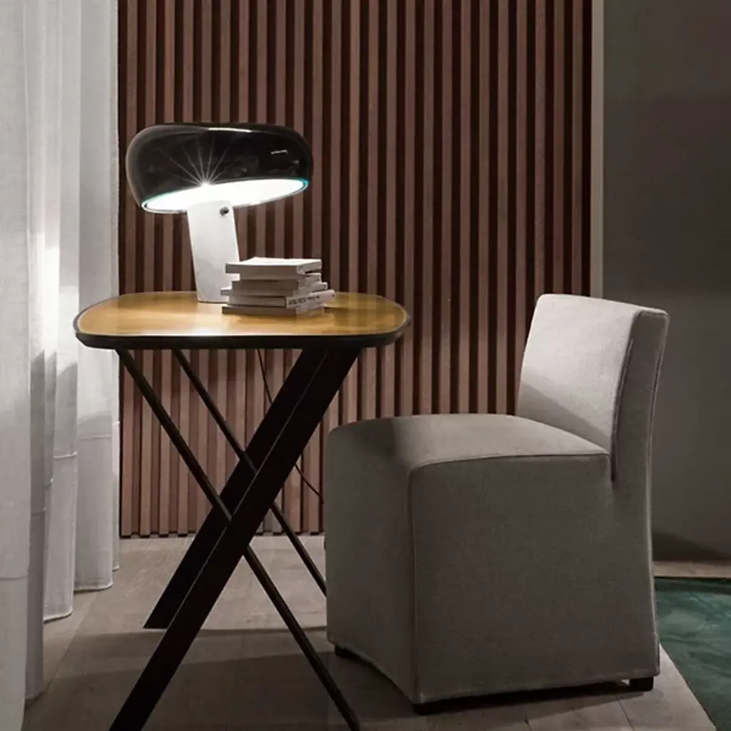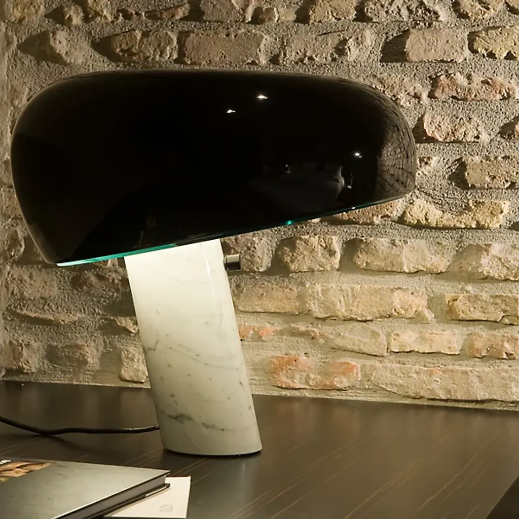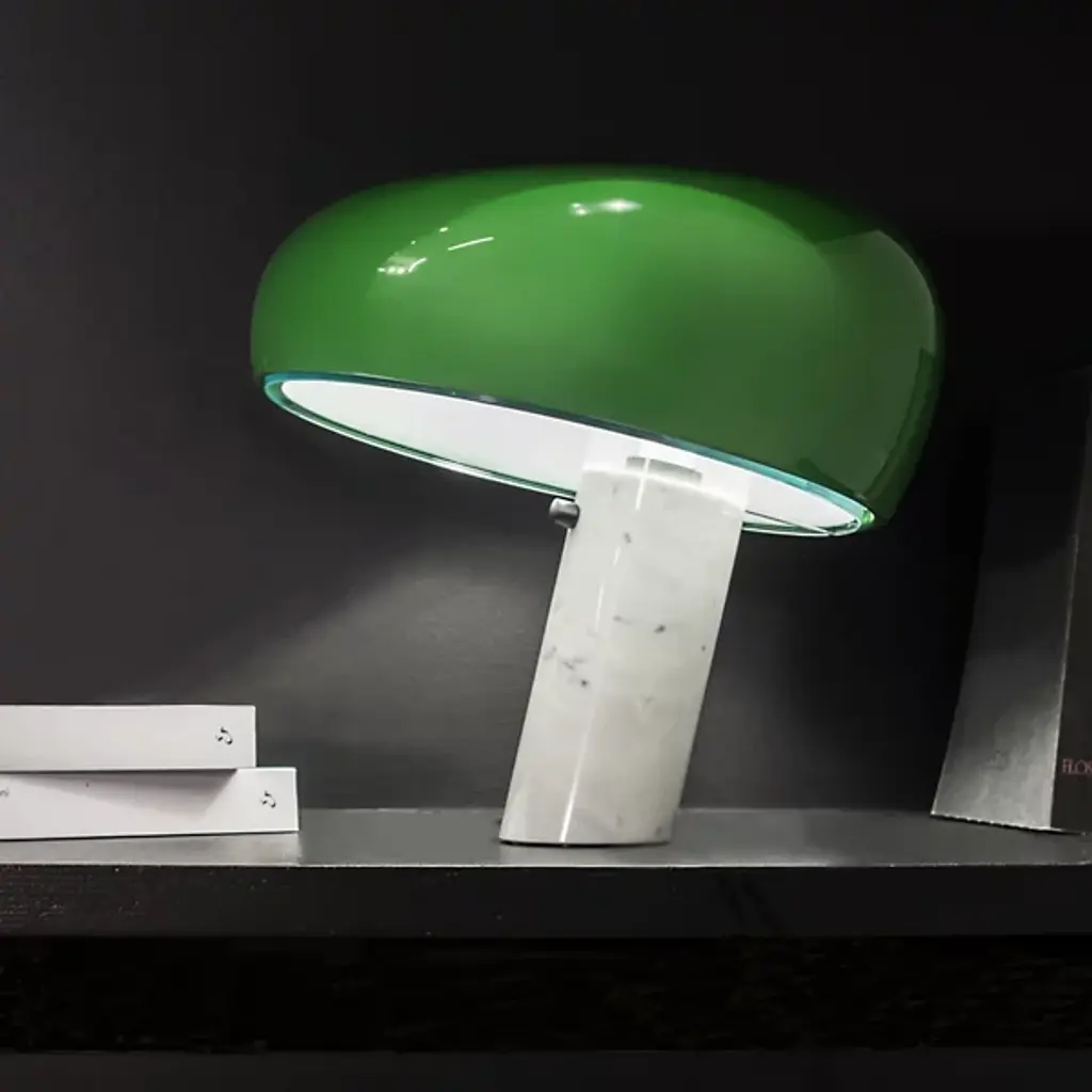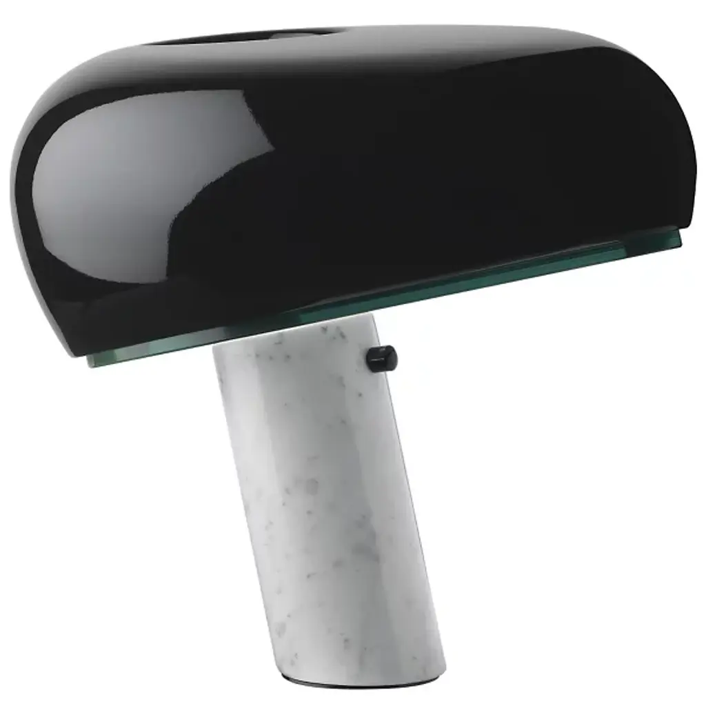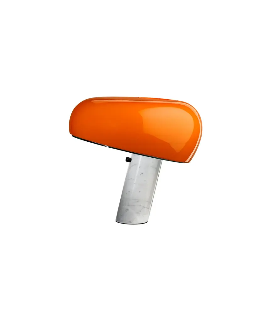 The FLOS Snoopy Table Lamp is the 2003 reintroduction of an original design by Achille and Pier Giacomo Castiglioni in 1967. The enameled shade comes in a variety of colors and works with a thick disc of glass to diffuse a bright wash of task lighting. This singular structure rests in perfect balance on the White marble base, which features an integral, user-friendly dimmer.