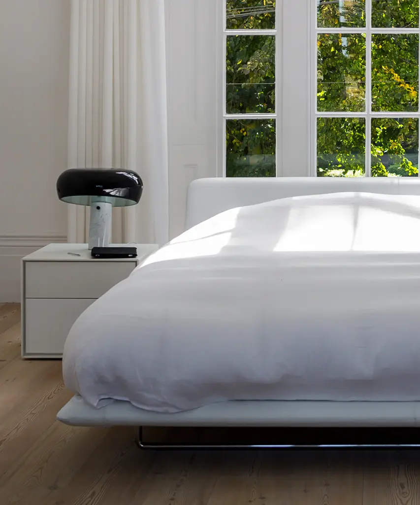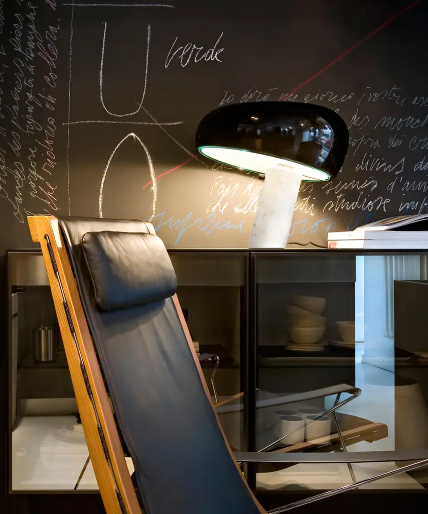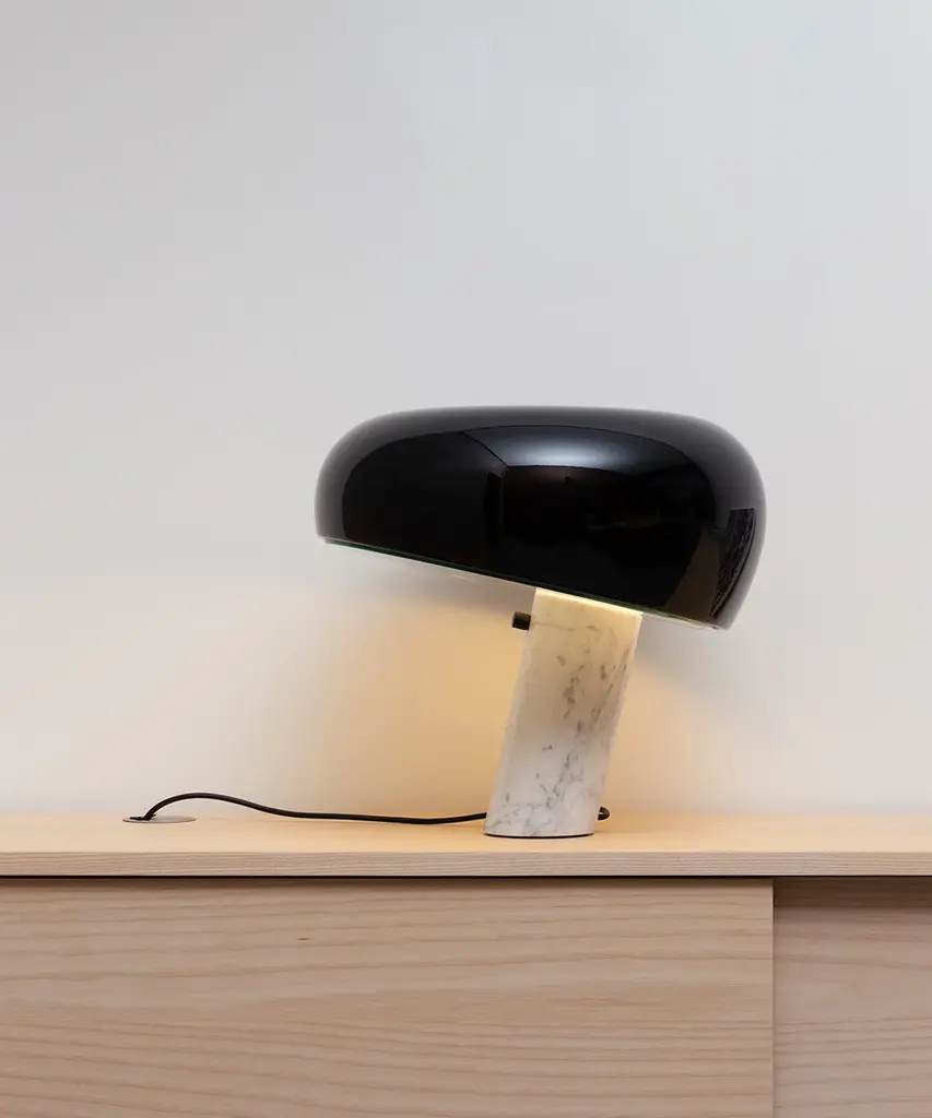 The playful personas of the Castiglioni brothers are evident in their marble Snoopy design, named for the beloved cartoon character and featuring a distinctive, light-hearted shape. The original debuted in 1967, and this version was reintroduced in 2003 with updated technology. The Snoopy modern desk lamp provides direct light through a thick glass disk and an enameled reflector, both resting in perfect balance on a white marble base. There is an internal dimmer and switch. Inspiration behind the design: With the Snoopy, brothers Achille and Pier Giacamo Castiglioni pay tribute to the sweet natured character by Charles M. Schulz. This authentic design is produced in Italy exclusively by Flos.