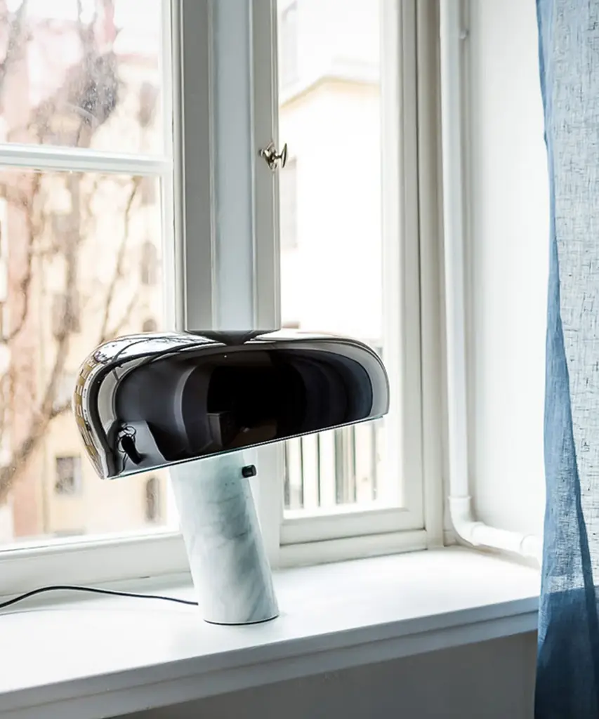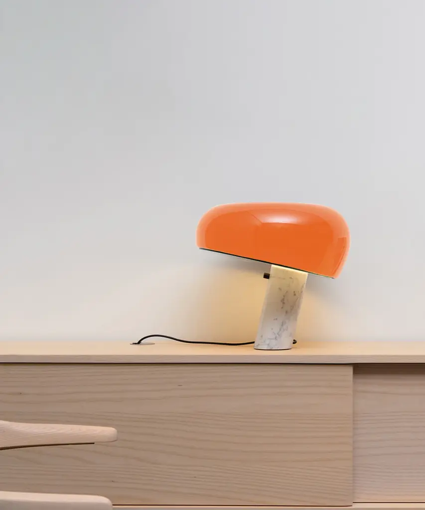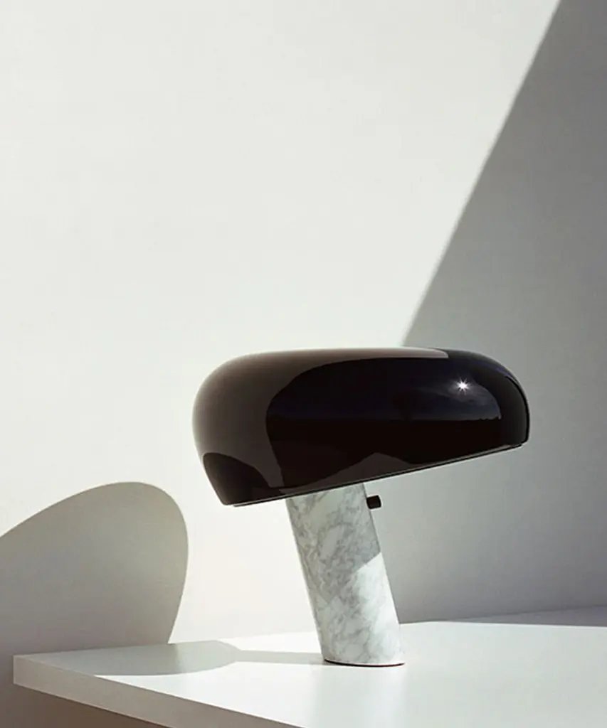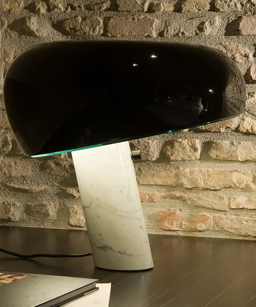 The playful personas of the Castiglioni brothers are evident in their marble Snoopy design, named for the beloved cartoon character and featuring a distinctive, light-hearted shape. The original debuted in 1967, and this version was reintroduced in 2003 with updated technology. The Snoopy modern desk lamp provides direct light through a thick glass disk and an enameled reflector, both resting in perfect balance on a white marble base. There is an internal dimmer and switch. Inspiration behind the design: With the Snoopy, brothers Achille and Pier Giacamo Castiglioni pay tribute to the sweet natured character by Charles M. Schulz. This authentic design is produced in Italy exclusively by Flos.