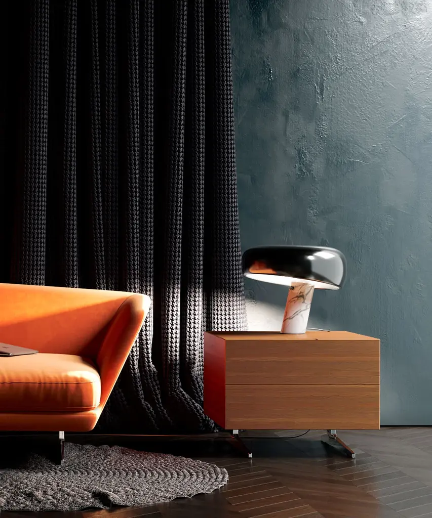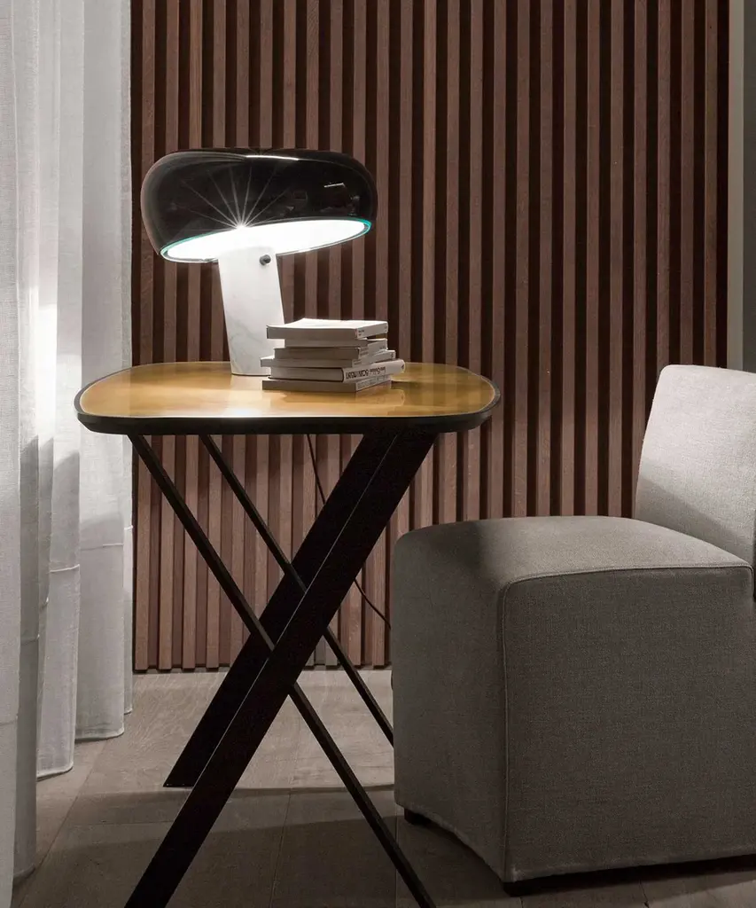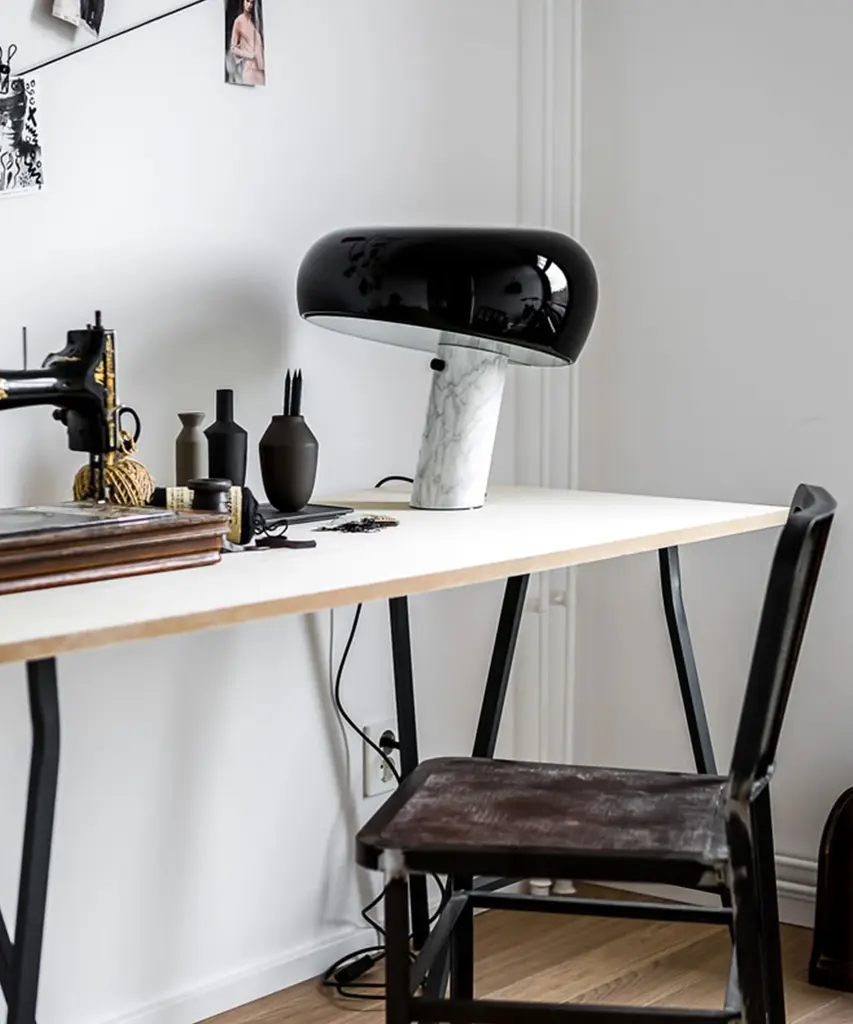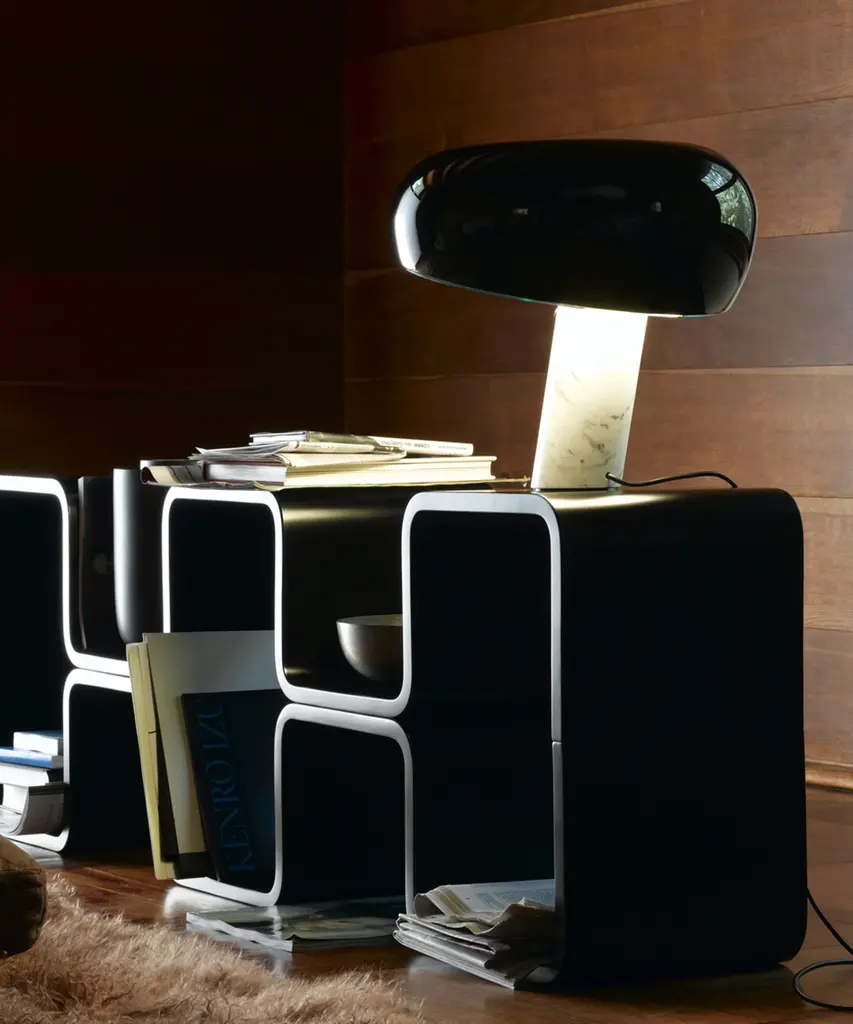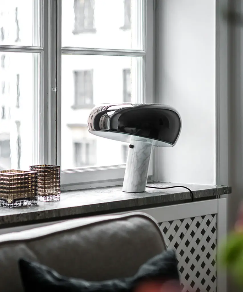 The playful personas of the Castiglioni brothers are evident in their marble Snoopy design, named for the beloved cartoon character and featuring a distinctive, light-hearted shape. The original debuted in 1967, and this version was reintroduced in 2003 with updated technology. The Snoopy modern desk lamp provides direct light through a thick glass disk and an enameled reflector, both resting in perfect balance on a white marble base. There is an internal dimmer and switch. Inspiration behind the design: With the Snoopy, brothers Achille and Pier Giacamo Castiglioni pay tribute to the sweet natured character by Charles M. Schulz. This authentic design is produced in Italy exclusively by Flos.