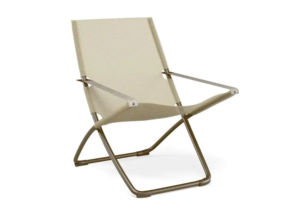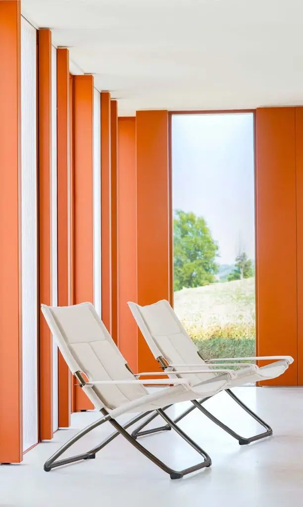 Large dimensions and a comfortable contour are the main features of Snooze. The frame is made in tubular steel and comes in different colours to be matched with the several variations in the cloth. All metal components are separated by plastic elements. The armchair can be regulated in two positions – reading and resting – thanks to a simple yet original mechanism on the armrests. The collection consists of: deck chairs, director's chair, footrest and stackable deckchair. The new Cozy deckchair, designed for the indoor version, is in synthetic knit and microfiber.Colori disponibili: Struttura: bianco, nero, rosso scarlatto, verde, blu, tortoraTessuto tecnico: ghiaccio, lampone, bianco, citronella, beige, pesca, rosso, menta, celesteColori Cozy Snooze:Struttura: bronzo lucido, nero lucidoFronte Telo Sdraio cozy: avana, nero, grigio scuroRetro Telo e braccioli sdraio Cozy: avana, nero, grigio scuroSnooze fully interprets the classic deckchair thanks to its generous and enveloping dimensions and is available in various colourful versions which add a touch of liveliness to every setting. The deckchair comes with a practical support element that can also function as a footrest, available in the same range of colours as the deckchair, to which two new shades have been added. The small, foldable armchair completes this practical and fun three-piece set, with its memorable design, enhanced by energetic colour.